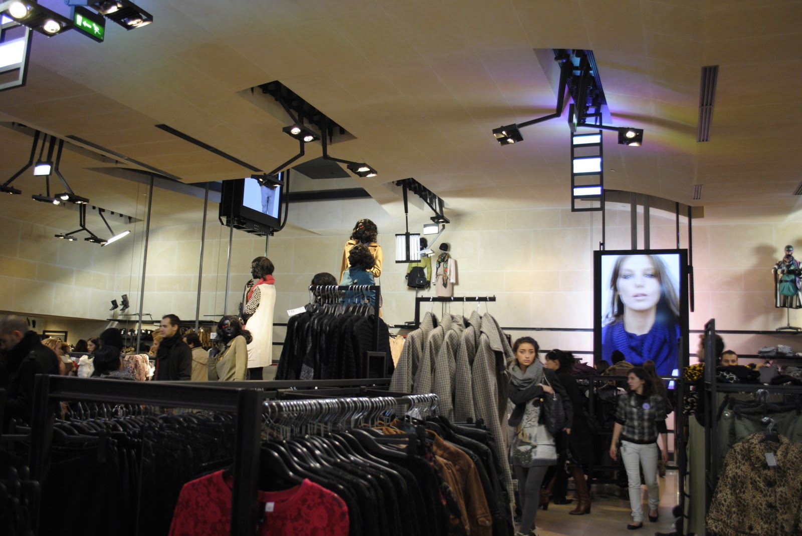 Après ce moment plein de joie il faut le dire, me voila dans H&M. J’adore le mélange matériaux. Beaucoup de métal noir! ascenseurs à gogo avec écrans accrochés, ce qui fait que les écrans montent et descendent. Canapés pour les parents et petits amis qui patientent. On règle la couleur de la lumière dans les cabines d’essayage ainsi que l’intensité. L’éclairage est extra ordinaire. Il surgit du plafond.