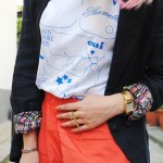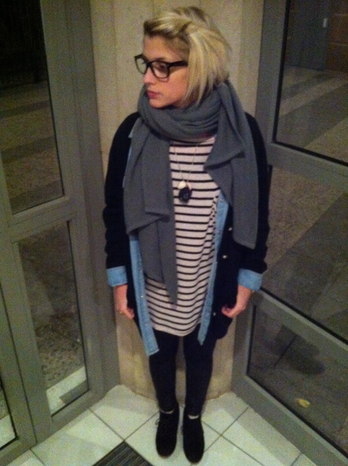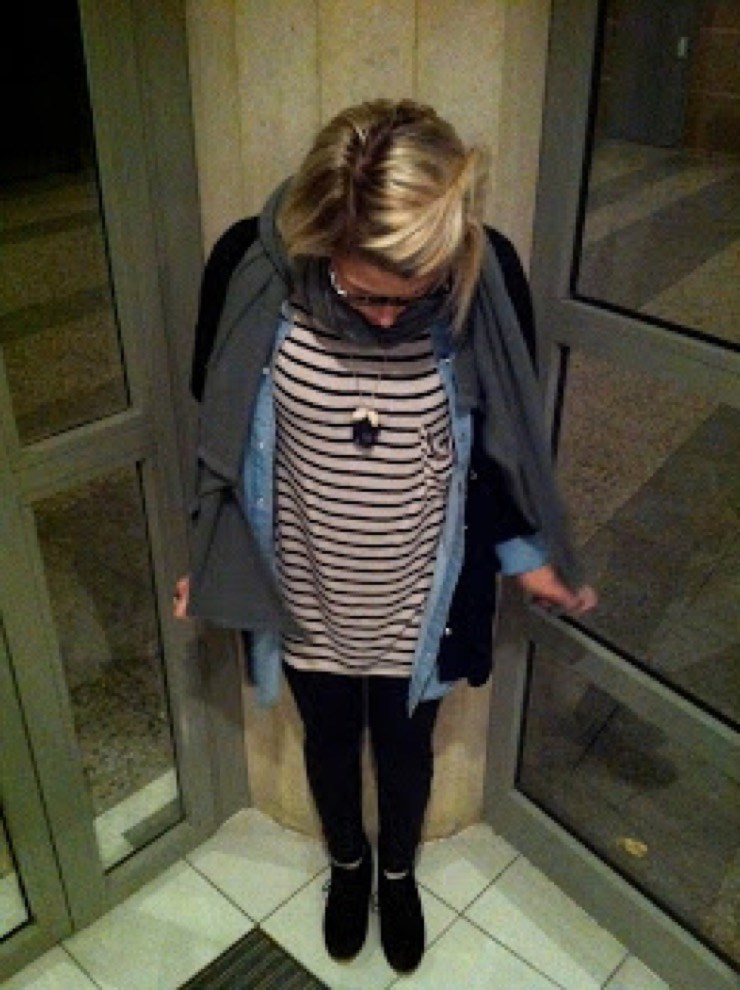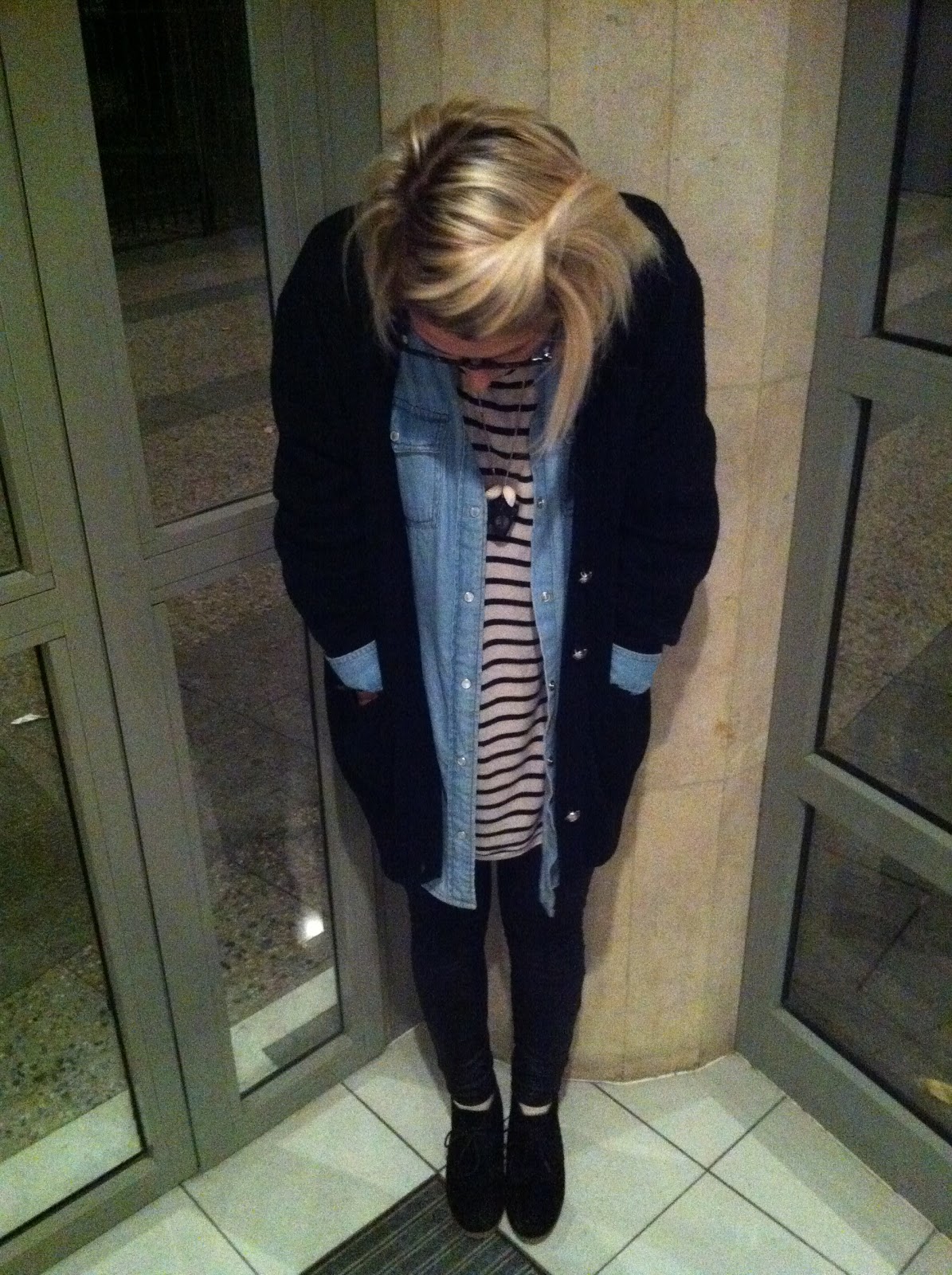 Gilet noir Burton noir, veste en Jean’s Top Shop, Long tee-shirt marinière Bershka, collier « made hand »(coquillage et mini appareil photo), tregging et nouvelles chaussures compensées.