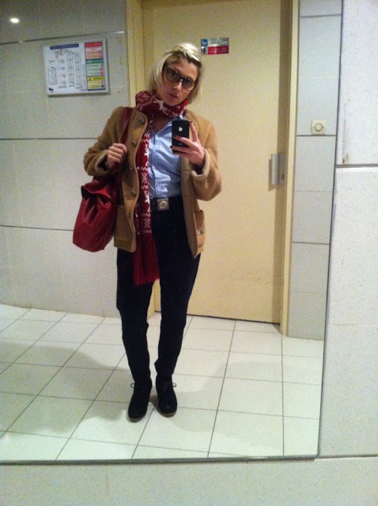 Chemise bleu, echarpe jacquard, veste laine camel avec broderies, pantalon noir 7/8, ceinture cochon vintage et compensées noires.