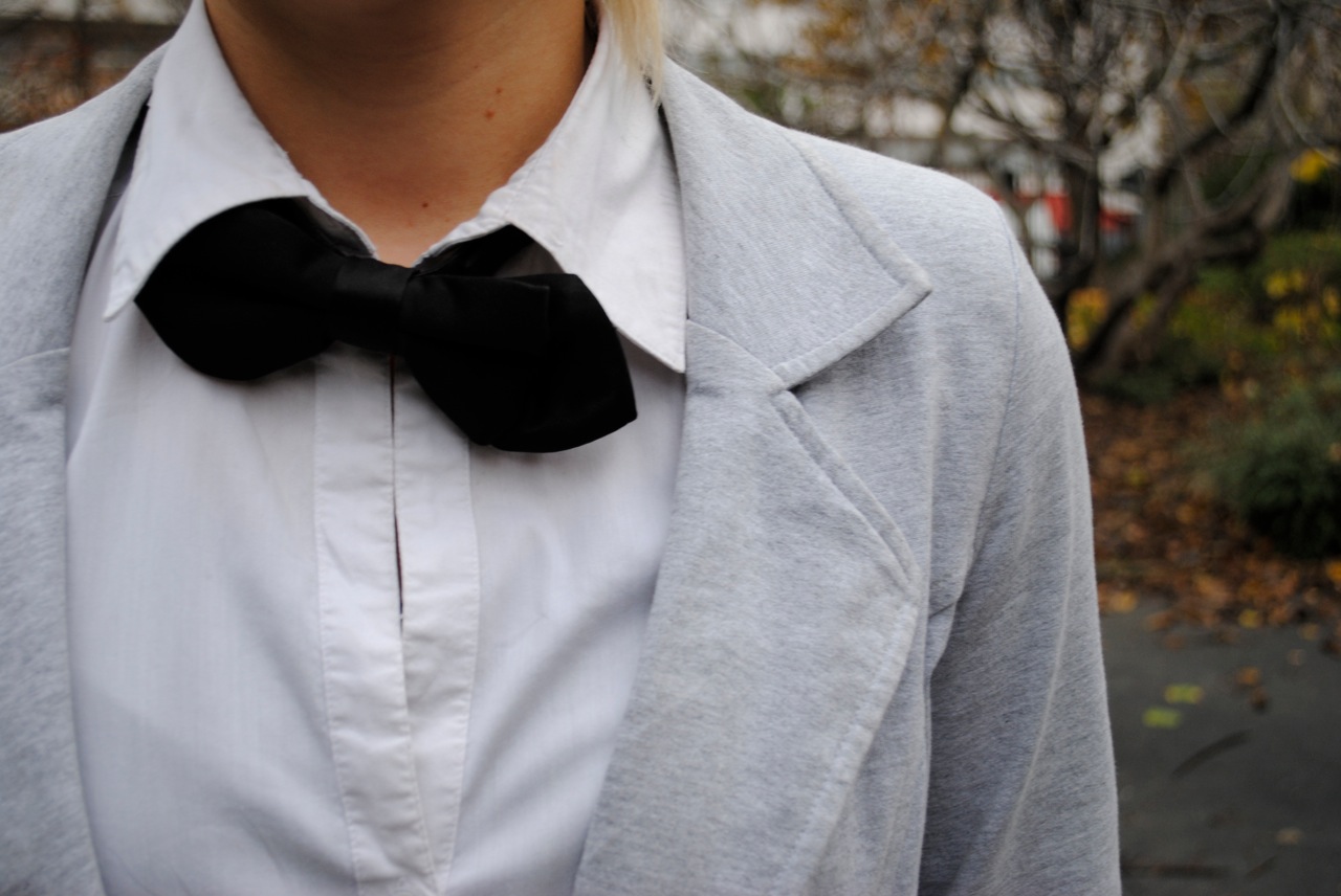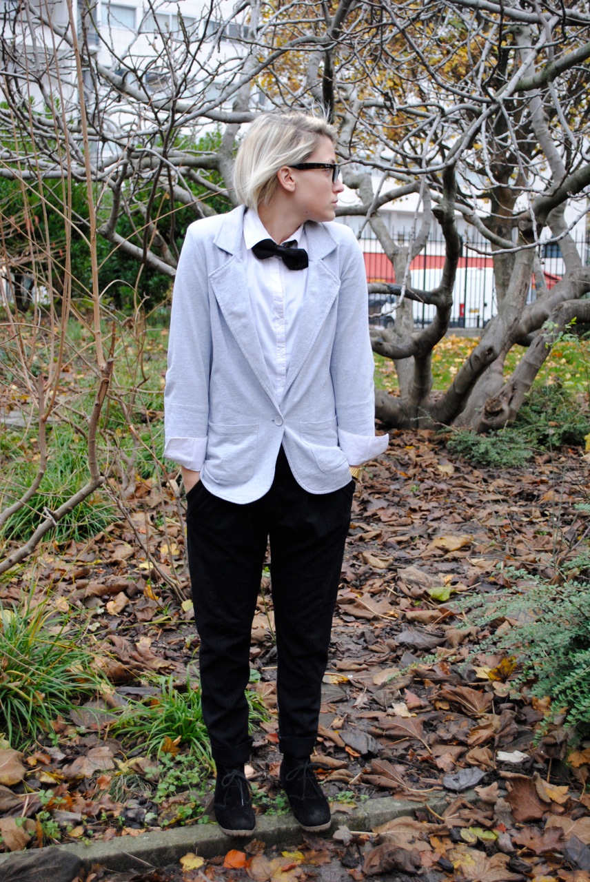Noeud papillon piqué au copain, chemise lefties, veste primark, pantalon zara, boots fripe.