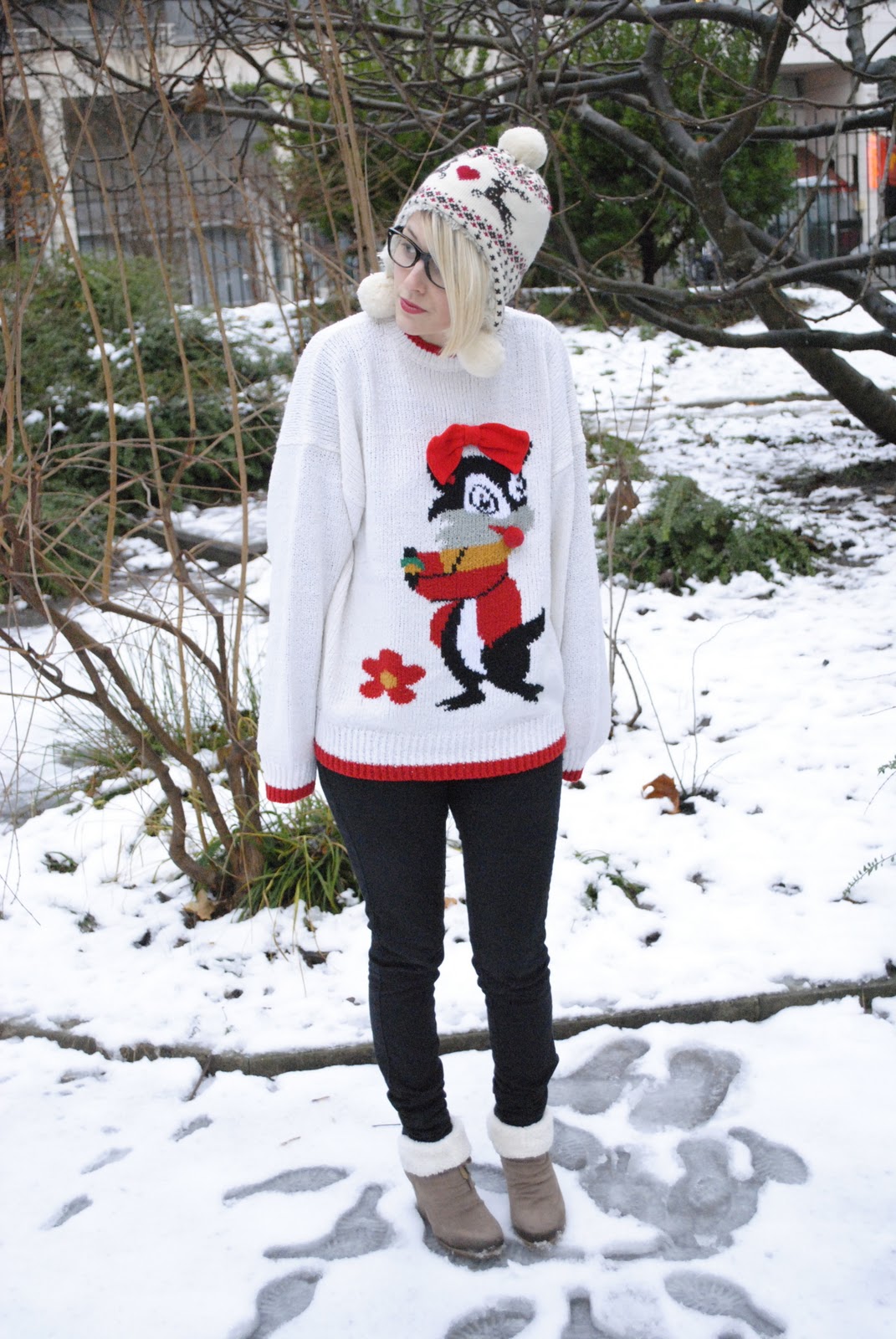 Tenue 1 : Bonnet Gap, Pull Emmaus, Slim Zara et bottines moutons.