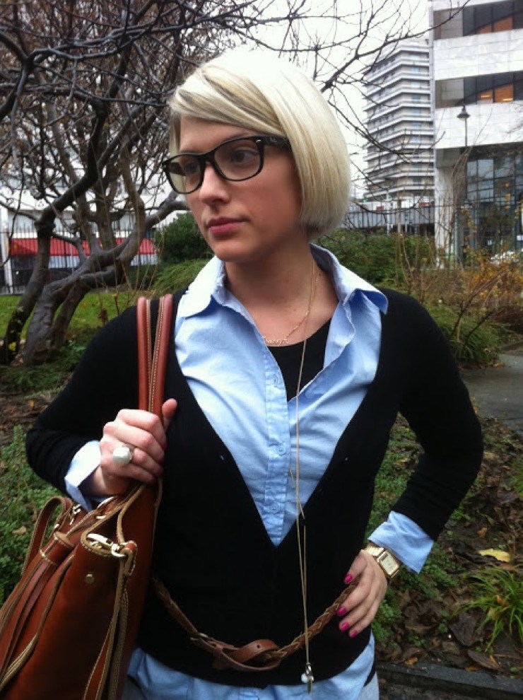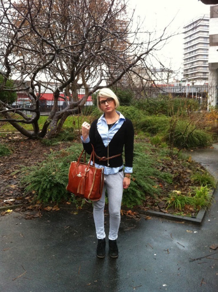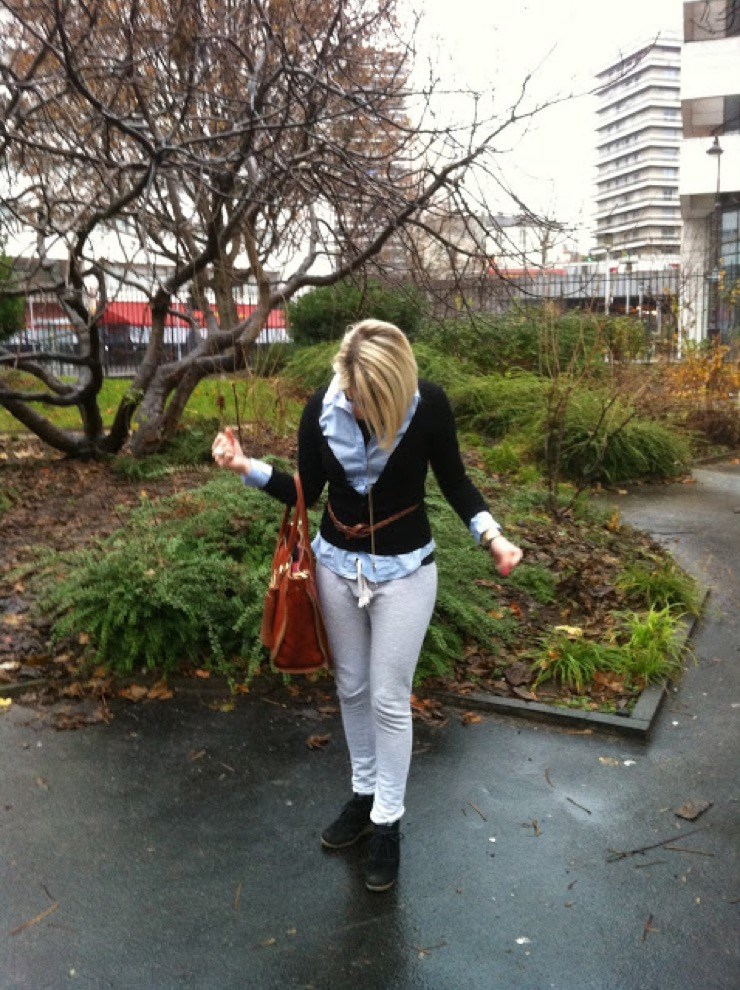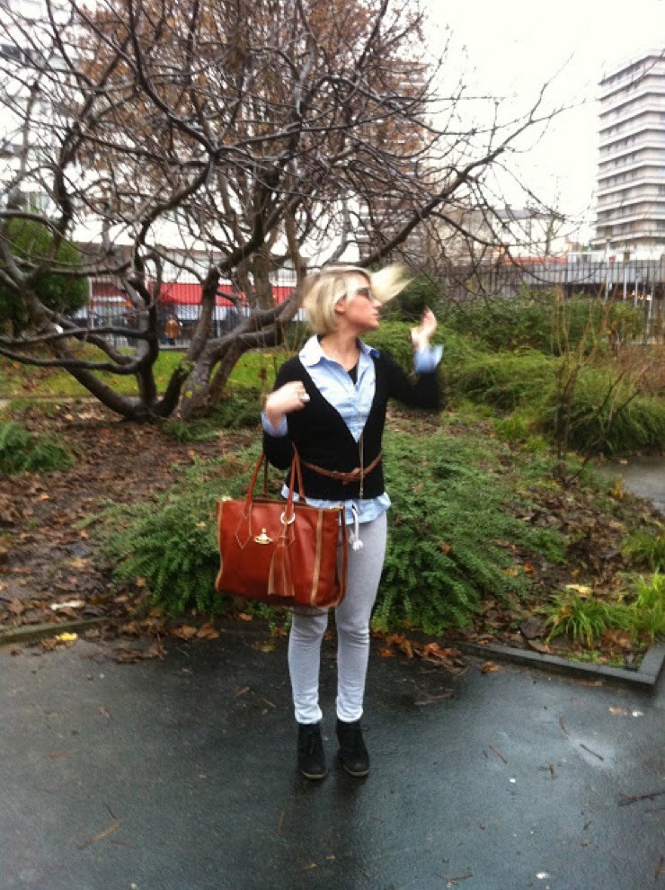 Doudoune Zara(enfant), GIlet noir Zara, chemise bleu Lefties, jogging gris Zara, ceinture tressée Primark, Chaussures fripe, grosse bague H&M et sac Vivienne Westwood.
