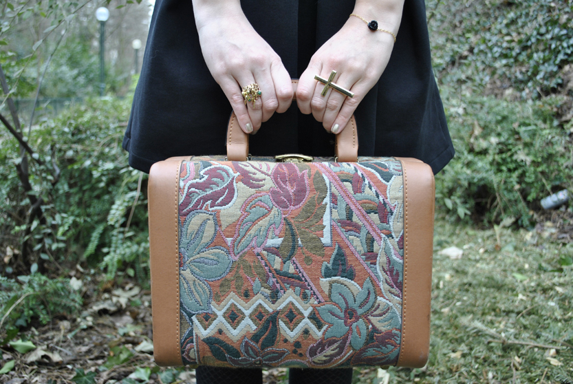 Robe ZARA, Hairband ZARA, bague ASOS (croix), l’autre Vintage (Mamie), vernis Doré, valise Emmaus, bracelets dorées (rose noire) créateur, collants Primark, chaussures compensées Newlook, et chaussures vernis (boucles dorées) Emmaus.