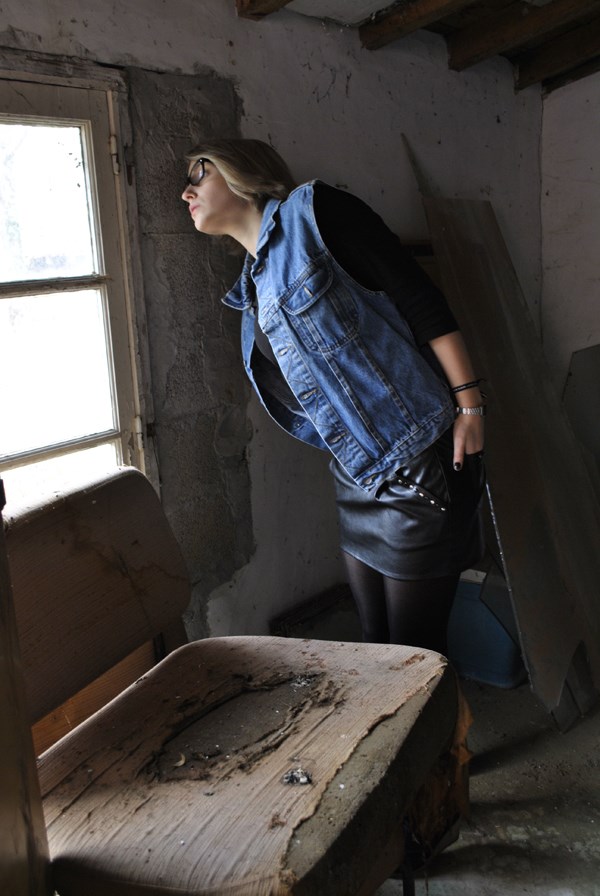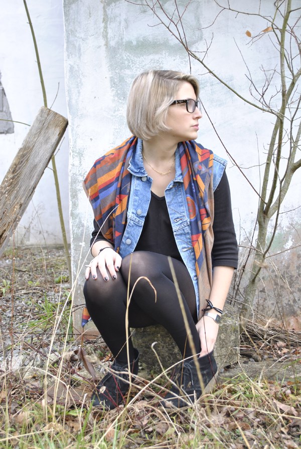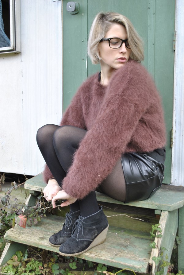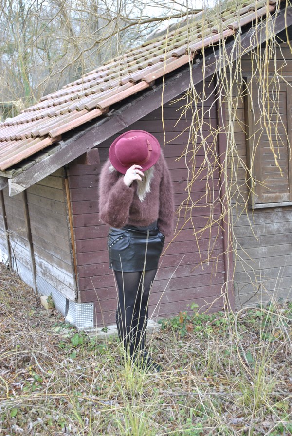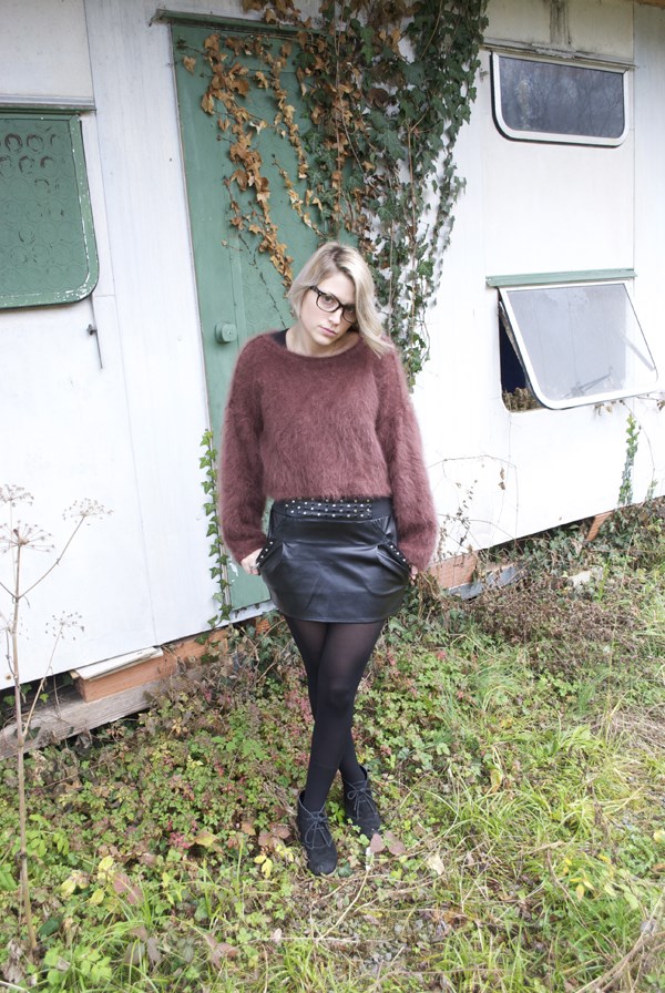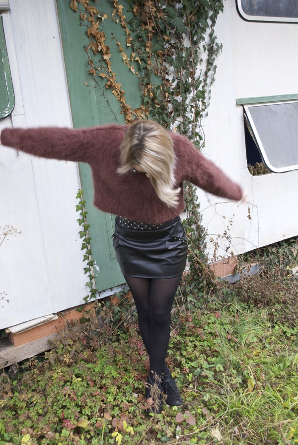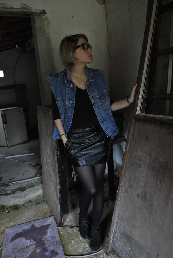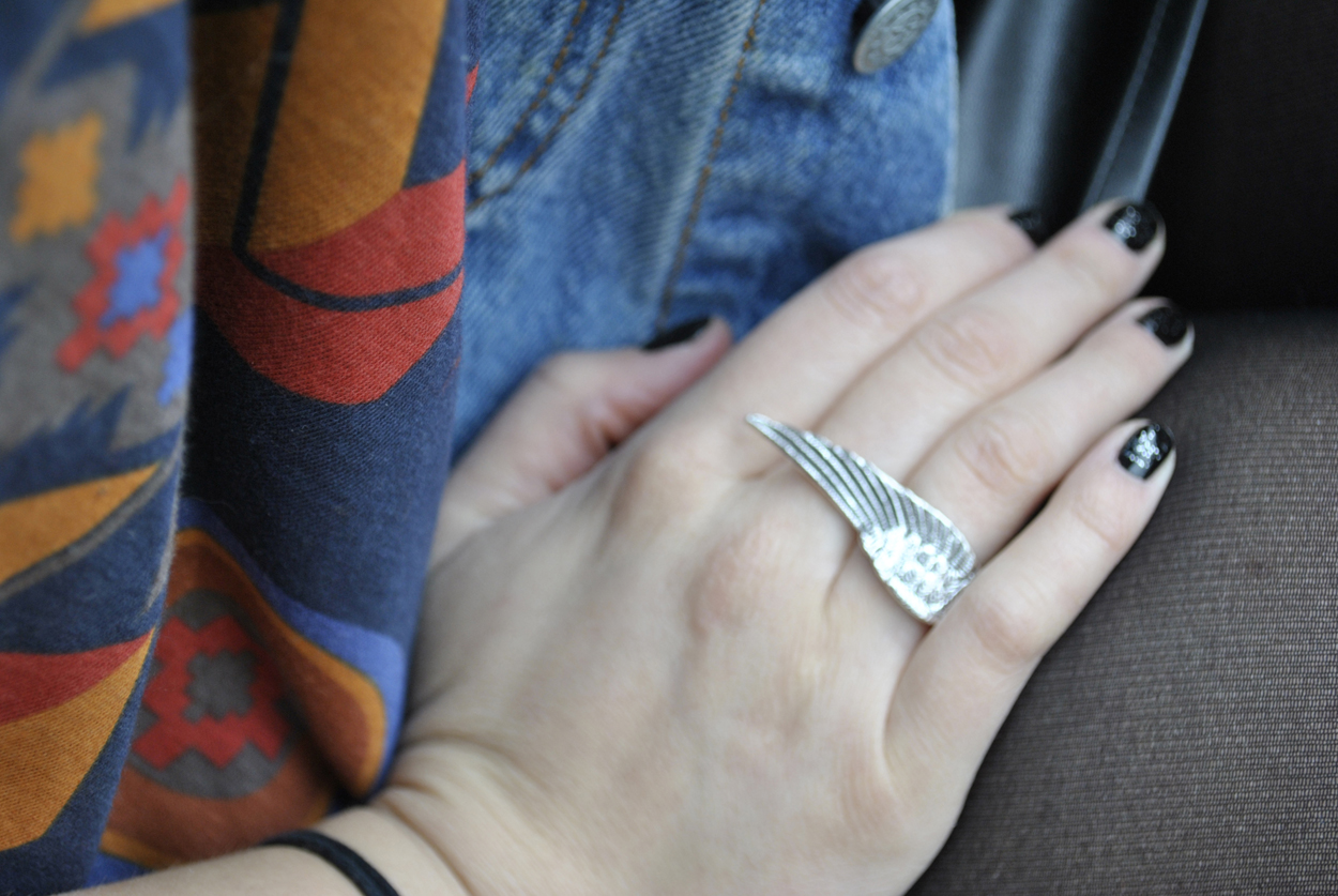 Jupe simili cuir, collant opaque noirs, compensées fripe, foulard indien plumes, bague asos « aile ».