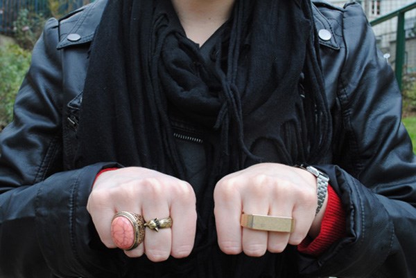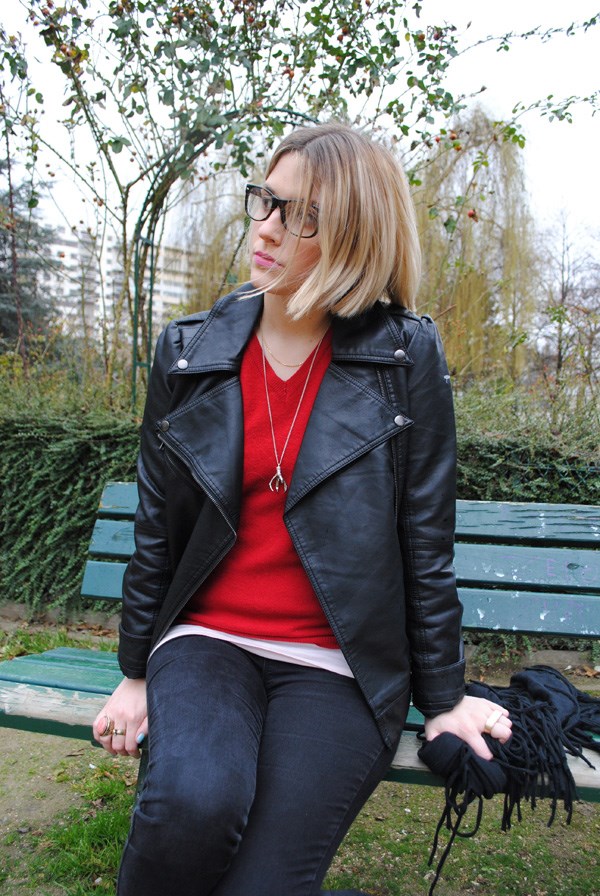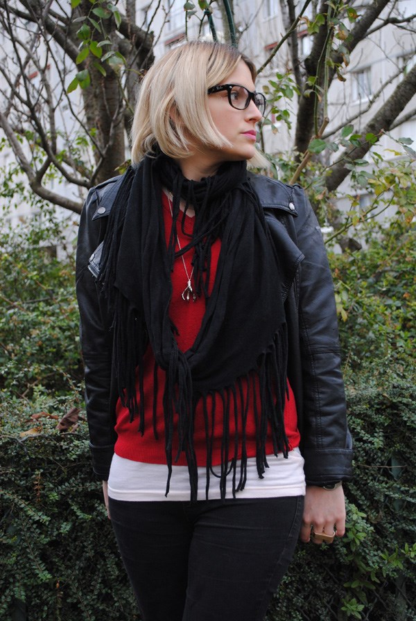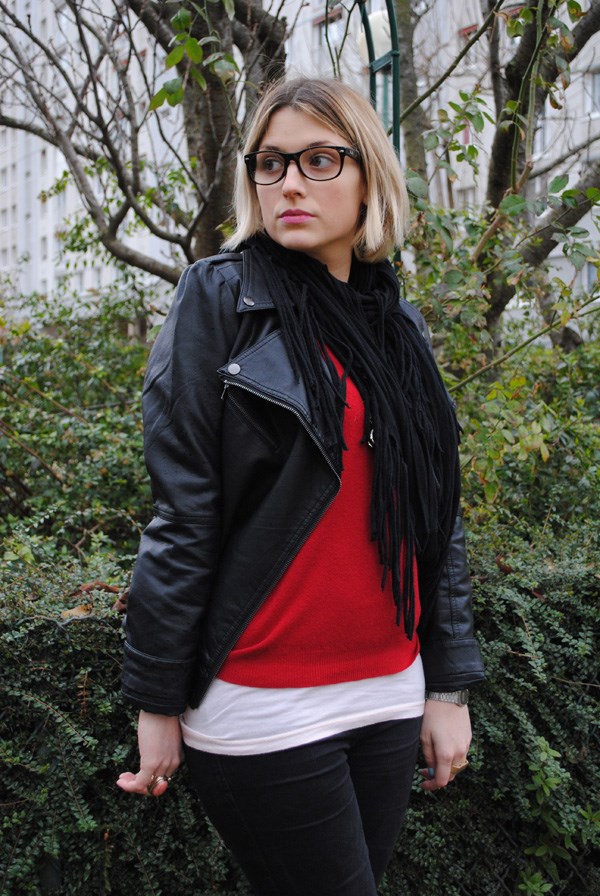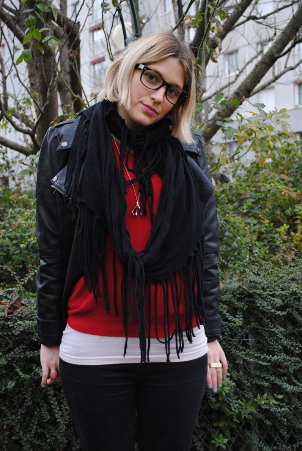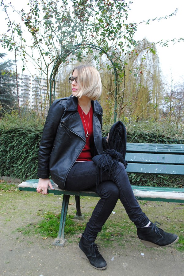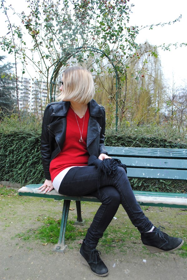 Perfecto, pull rouge en laine, débardeur rose clair, slim et écharpes Zara, compensées noires, montre Casio et bagues H&M.