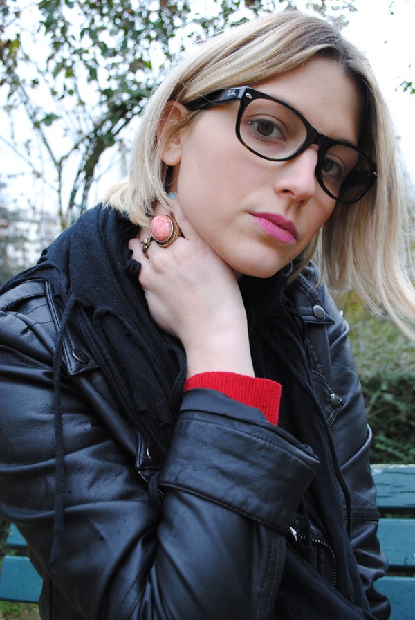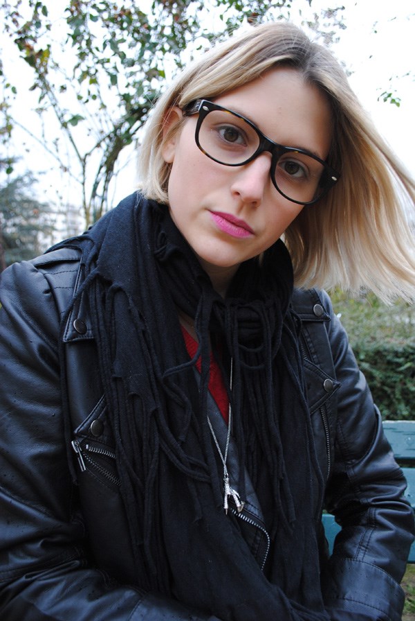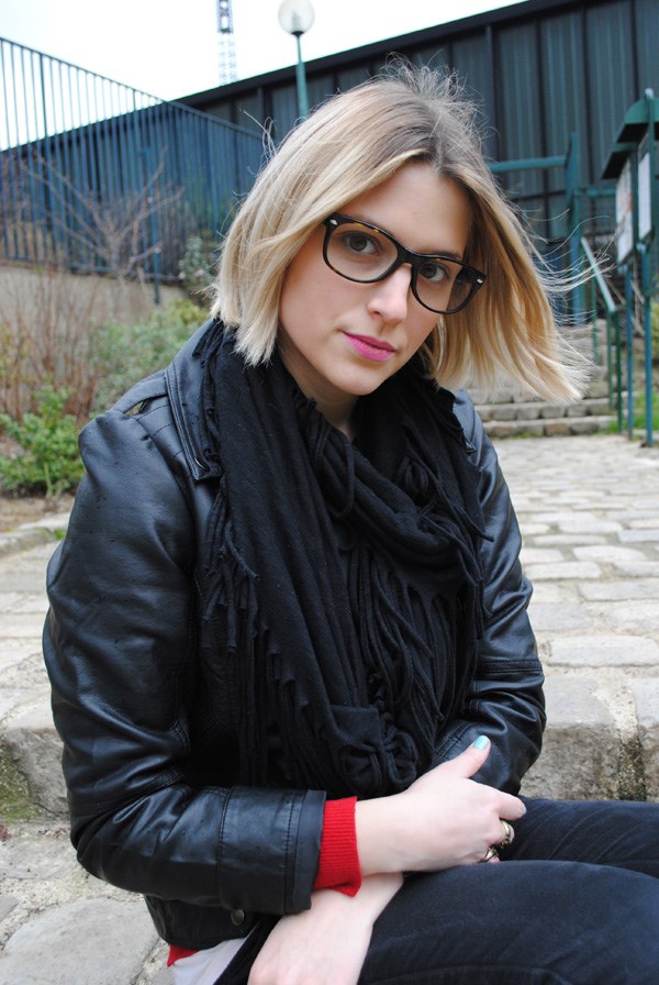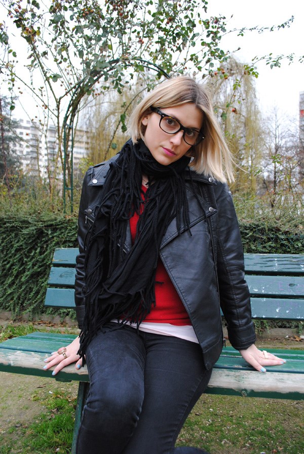 Samedi après-midi. Le beau soleil d’hier a disparu mais il fait toujours aussi doux. C’est une chance je peux porter mon nouveau Perfecto (simili) cuir. Ma dernière trouvaille aux soldes. Je suis ravie.