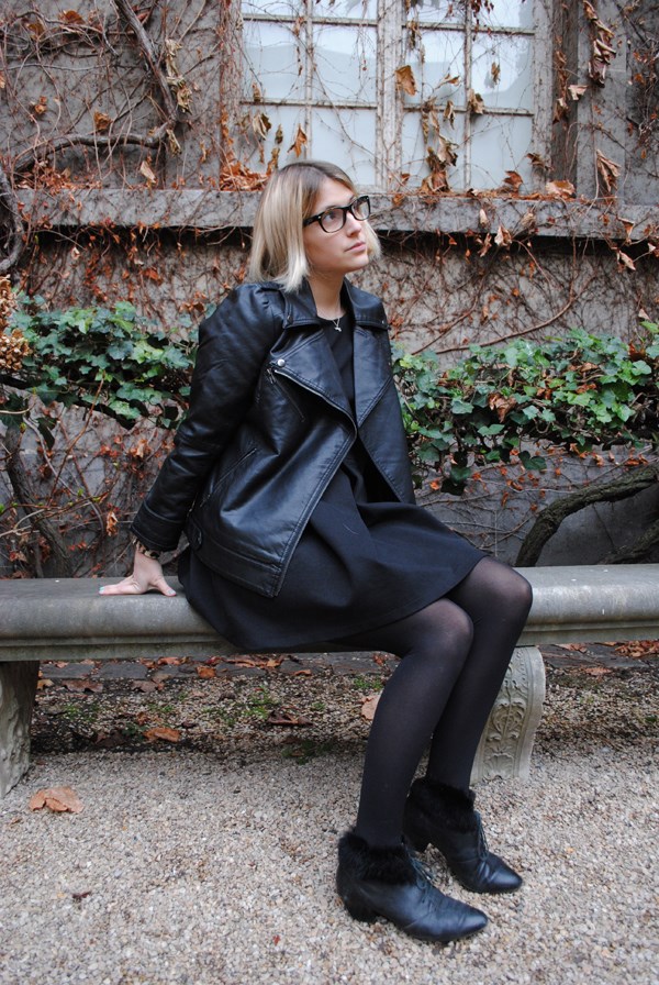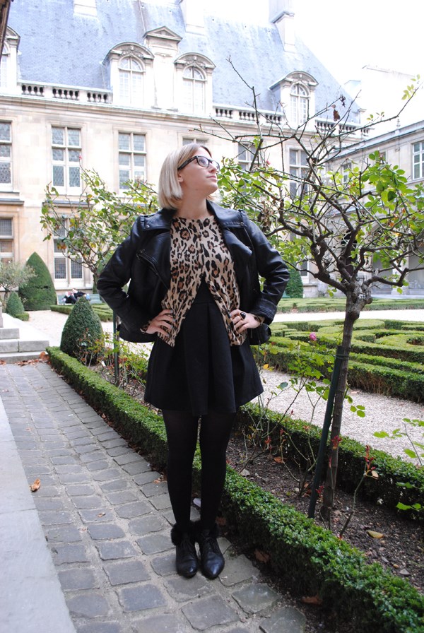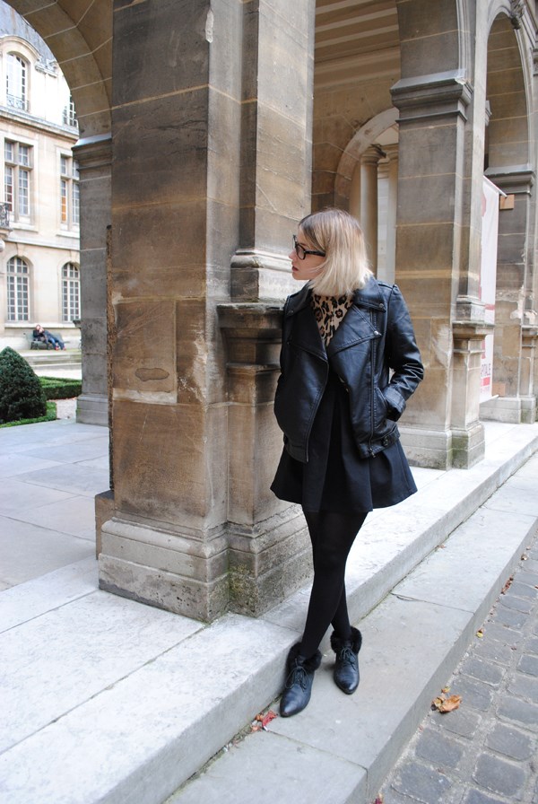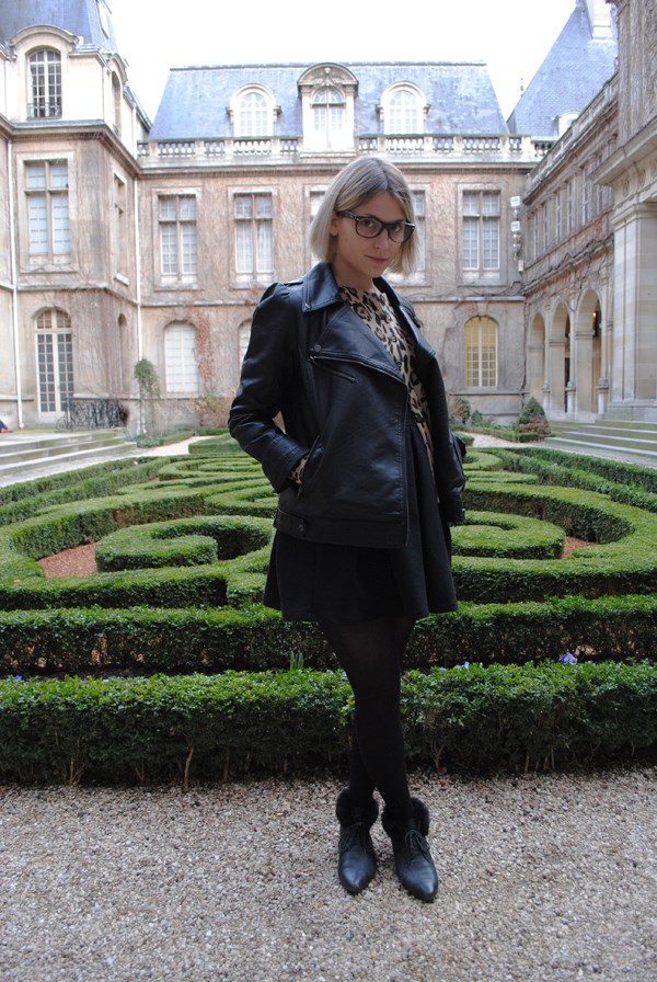 Robe et gilet léopard Zara, perfecto noir, collant opaque, bague h&m, bottines fausses fourrures noires vintage et mini collier « cheval » accessorize.