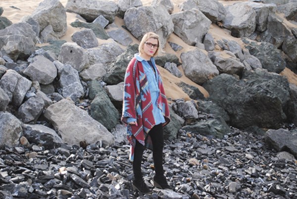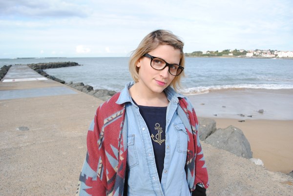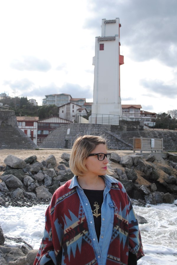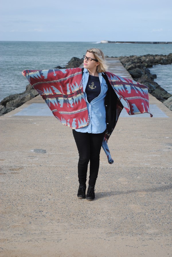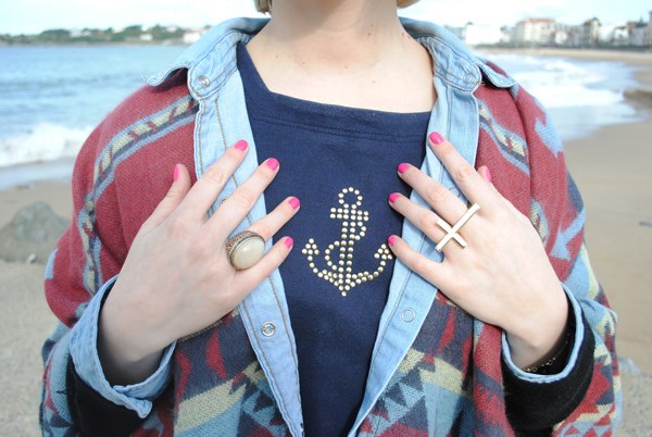 Tee shirt encre doré vintage, chemise en jean, gilet bouton encre doré, cape navarro Asos, slim zara, compensées frippe, bagues Asos et h&m.