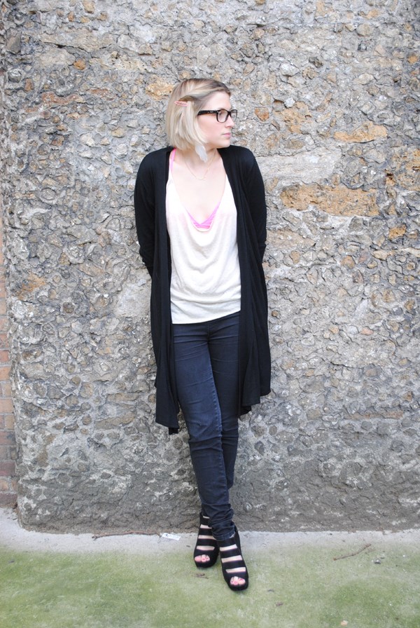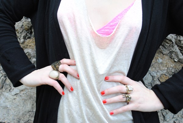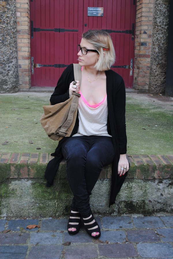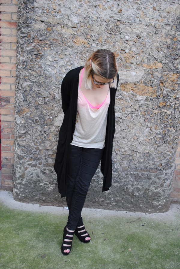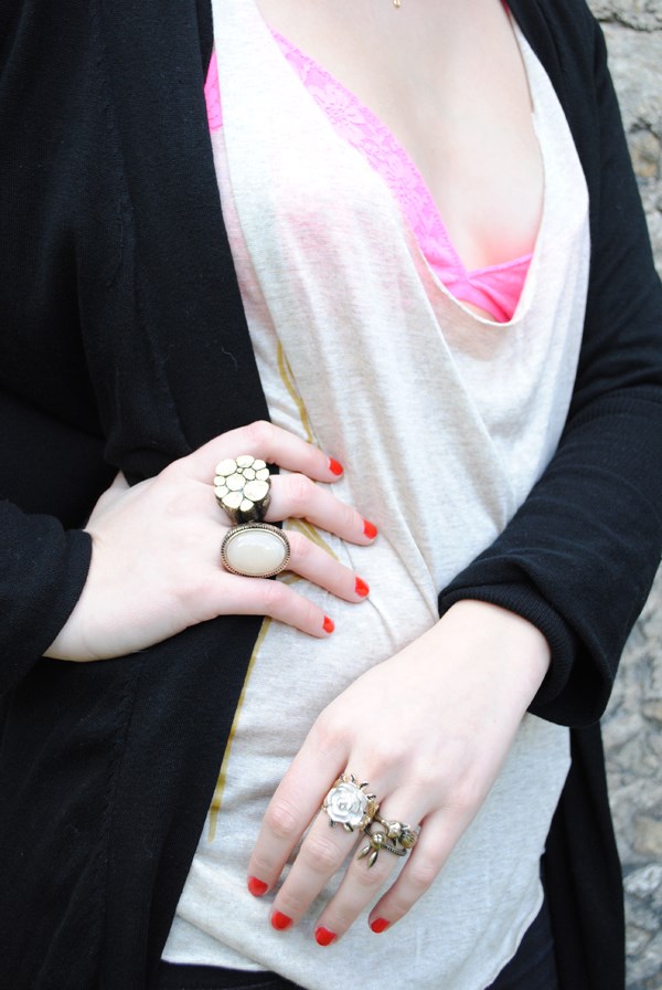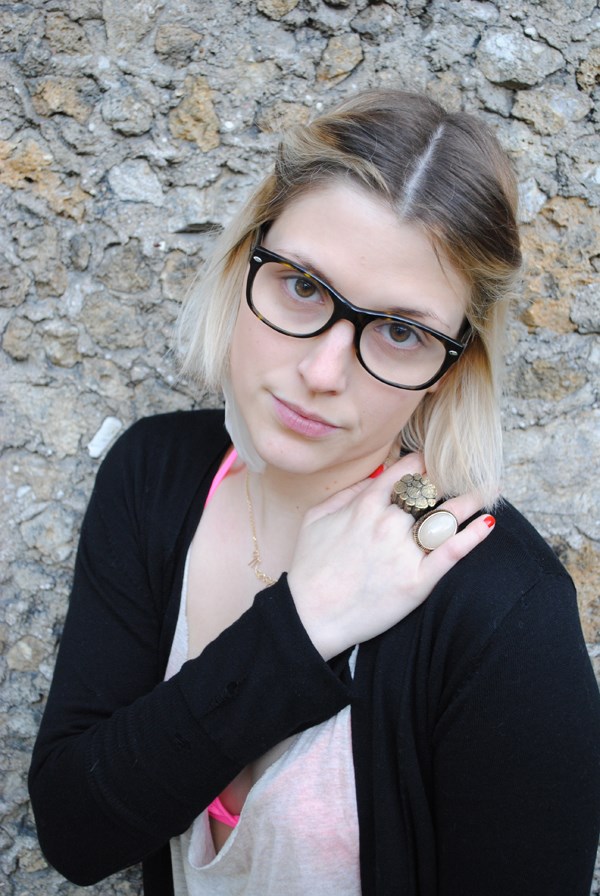 Boucle d’oreille plume Claire’s, débardeur Icône Pourpre, brassière fluo h&m, gilet long et slim Zara, compressées New Look, bague « bois » Asos et autres bagues H&M et sac Bershka.