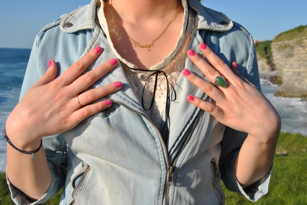 Robe dentelle et perfecto jean Zara, ruban noir, bague verte de ma mère, bracelet Braï, pochette Emmaus et ballerines indiennes.