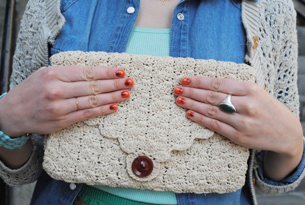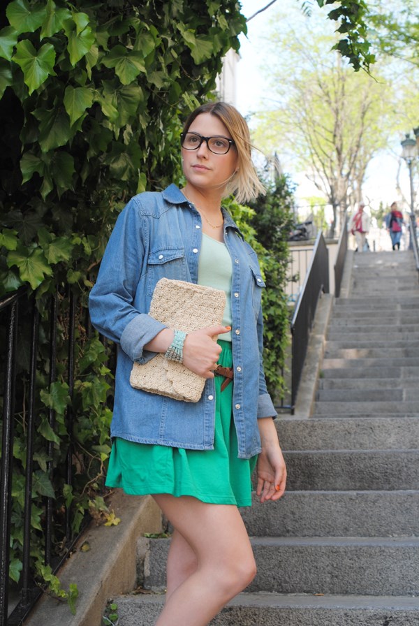 Veste en jean et top Atmosphère, ceinture tressée, jupe Zara, gilet New Look, ballerines indiennes, bracelet H&m, bague à Maman et pochette Emmaus.
