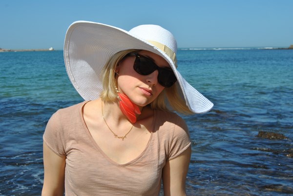 Chapeau blanc et boucle d’oreille Atmosphère, foulard Valentino, tee shirt H&M, vernis rose fluo et lunettes Ray Ban.