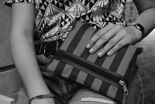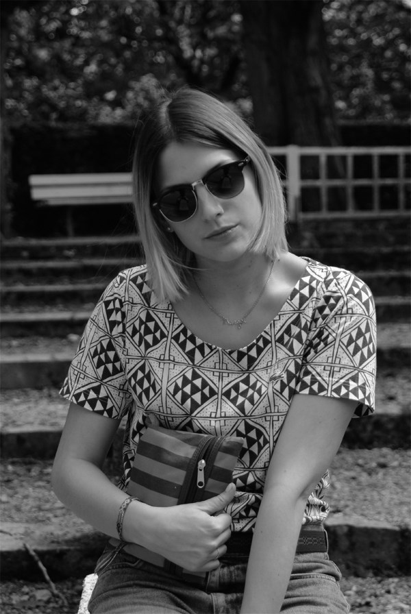 Superbes tes lunettes de soleil! Et la pochette rayée est belle, j'aimerai bien savoir de quelles couleurs elle est…?!