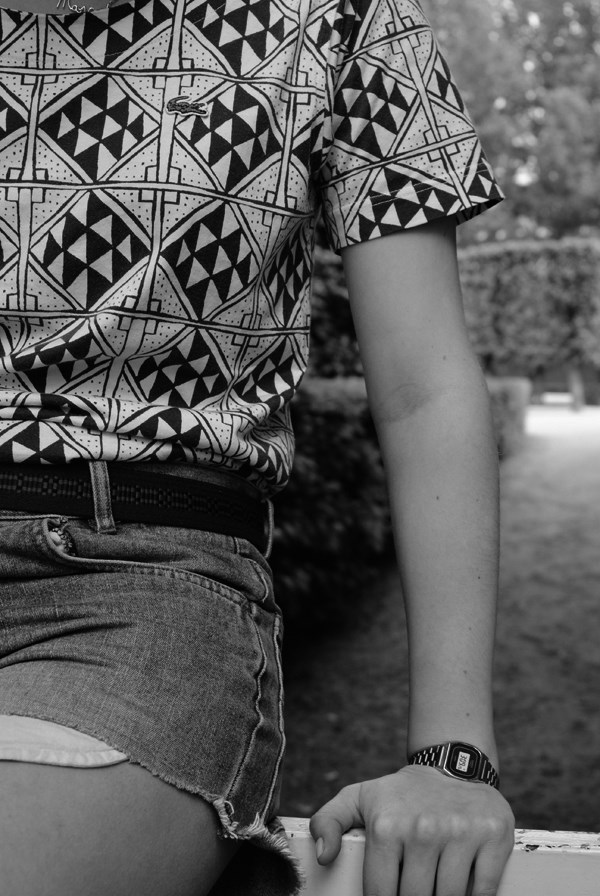 Tee shirt Lacoste Vintage, pochette H&m, vernis Barry M jaune, ceinture Emmaus, short Vintage, chaussures Victoria, lunettes de soleil club master et montre Casio.