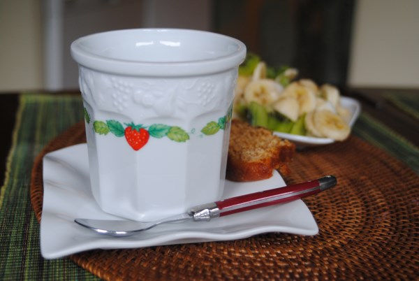 J’ai eu le droit moi aussi à un petit déjeuné de princesse. Salade de fruits frais, thé anglais et pain d’épice.