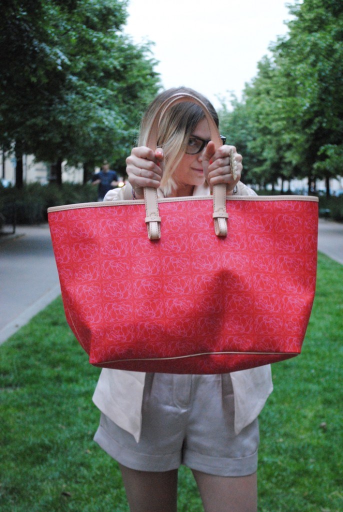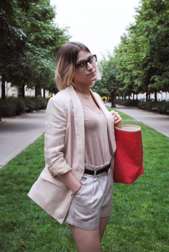 En ce moment je porte beaucoup de couleur beige, tea rose, rose poudre… alors j’ai choisi la couleur hindi rouge pour mon sac qui devient l’accessoire fort de ma tenue! Qu’en pensez-vous?