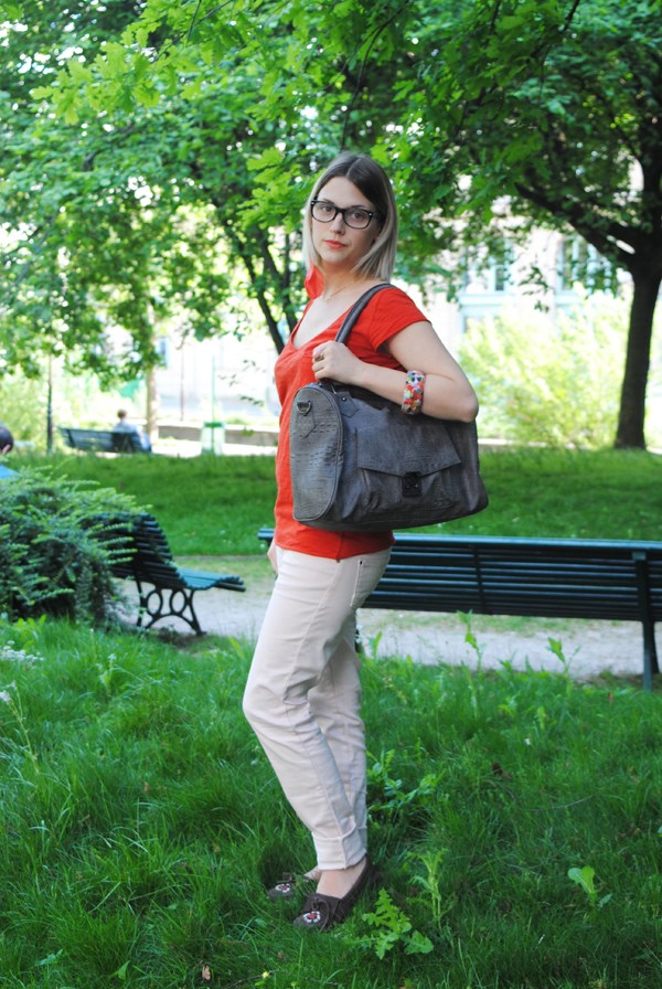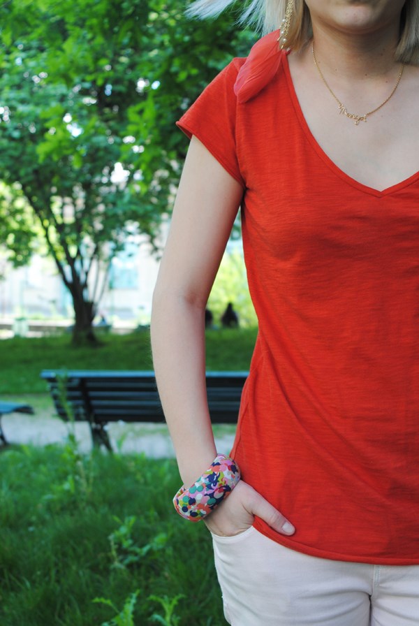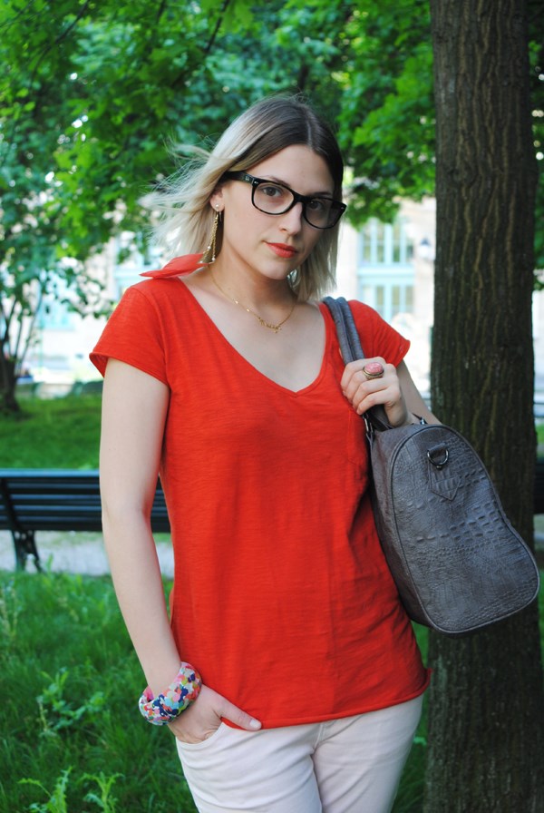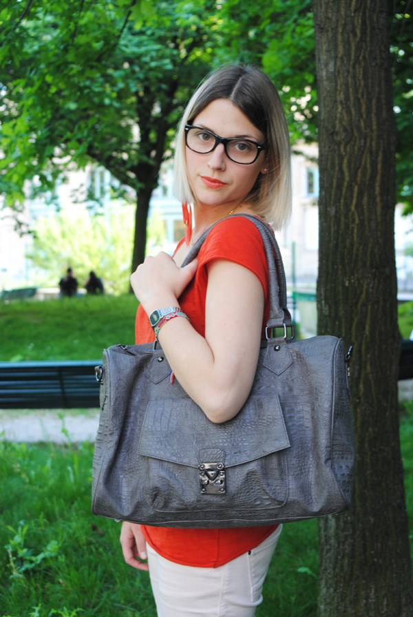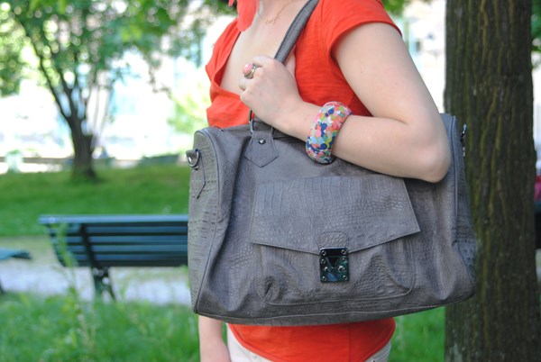 Ce sac est vraiment joli ! Je le verrai bien avec une petite robe fluide corail pour adoucir la couleur du sac avec des espadrilles à talons hauts. Au passage le bracelet est trop mignon! Voila ! 😉