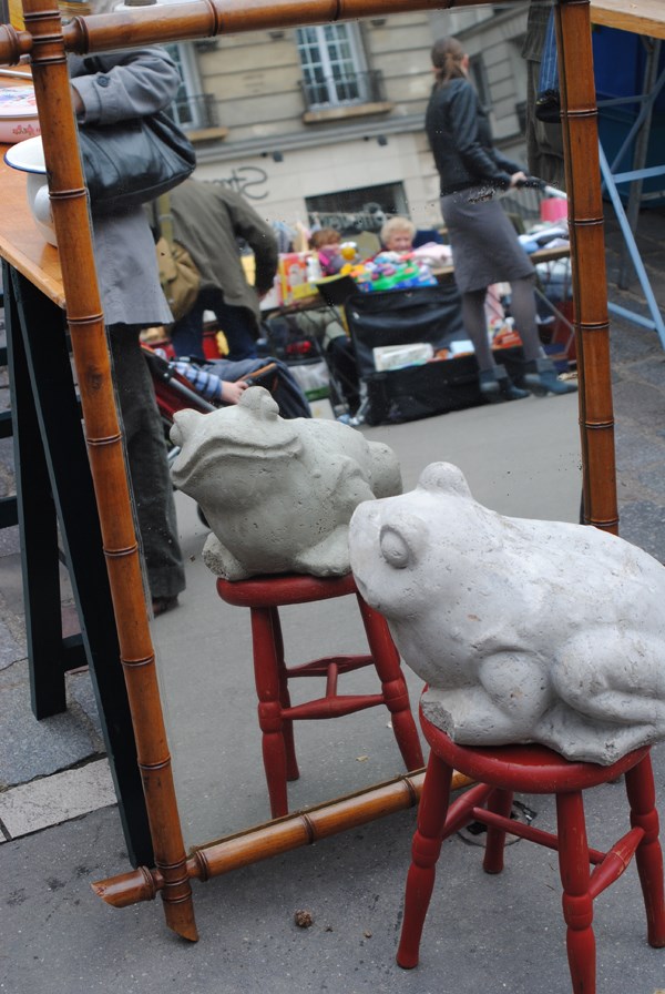 Brocante ce week end. J’ai vu (mais pas acheté …) cette ancienne Barbie case, avec la poupée dedans et tous ses vêtements sur des cintres. Adorable. J’ai craqué sur les mannequins et j’ai trouvé très drôle cette grenouille narcissique. J’y ai trouvé deux sacs. Un sac bourse et une mini pochette à plumes (pour sortir avec juste mon téléphone et carte métro).