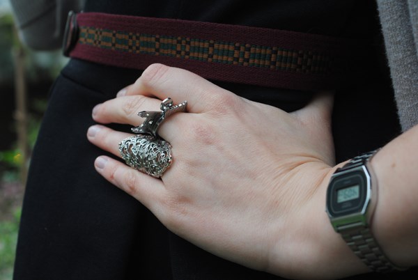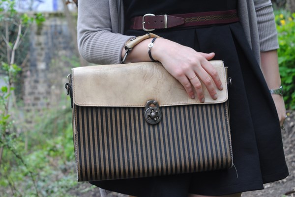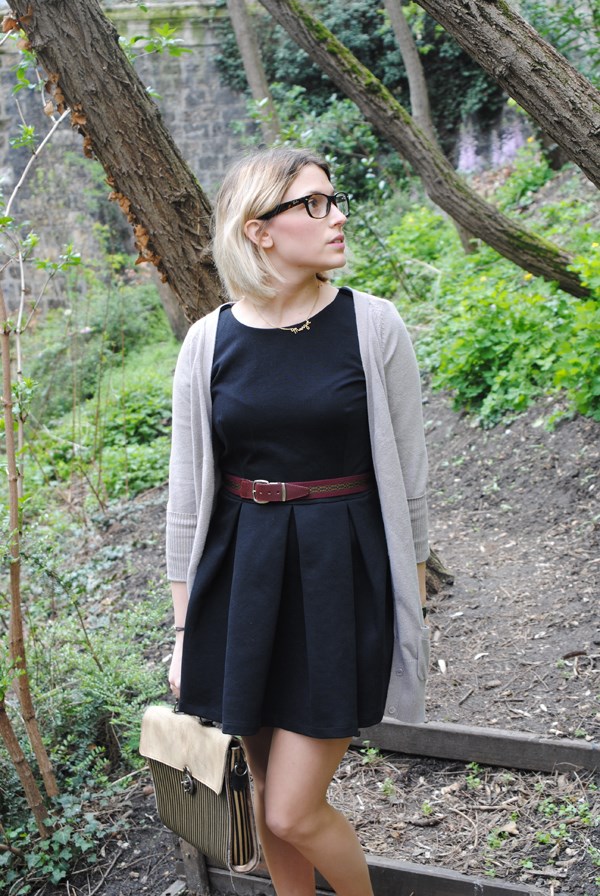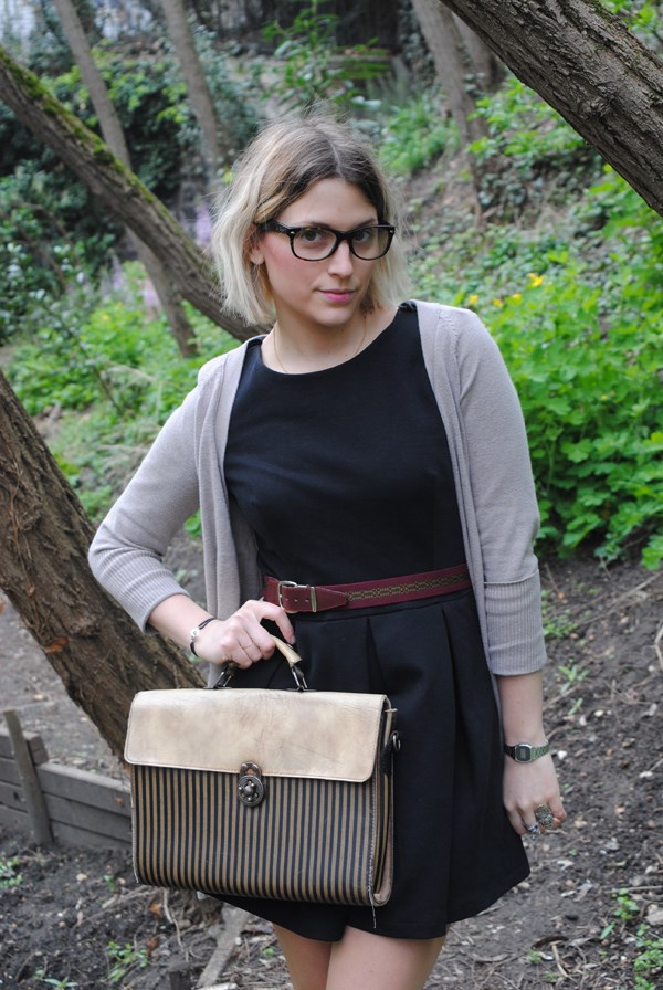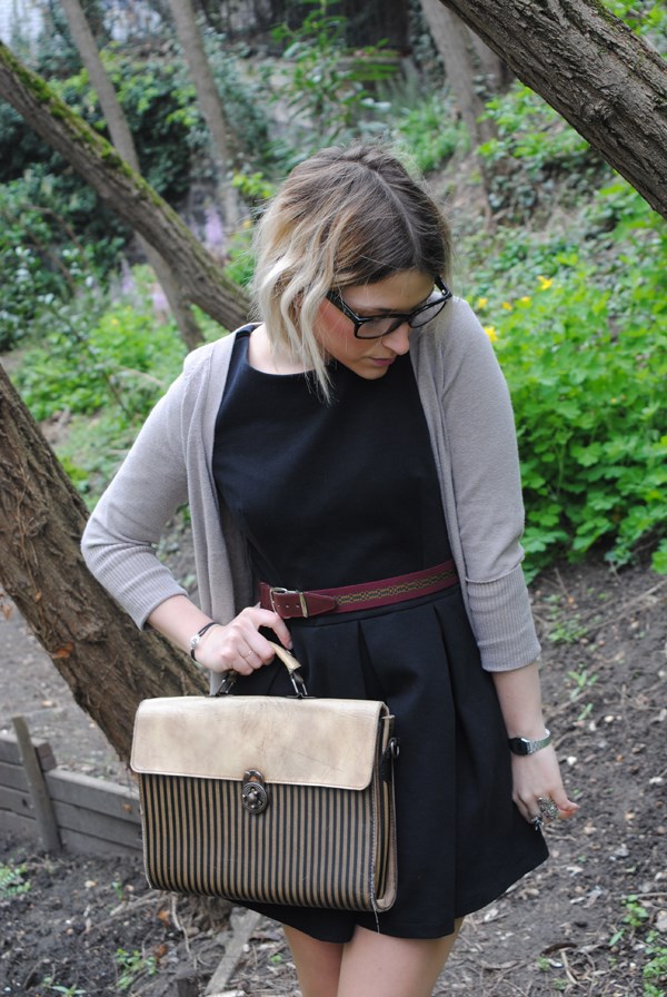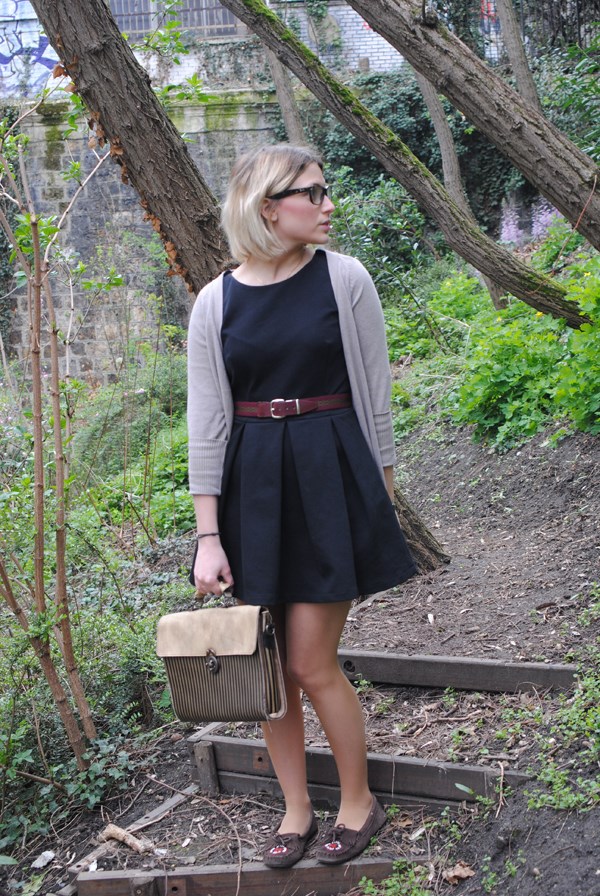 Robe et gilet Zara, collant opaque, ceinture et cartable emmaus, bagues H&M, montre casion, bracelet Dynh Van, ballerines indiennes.