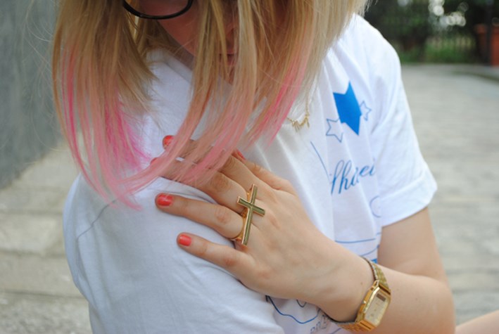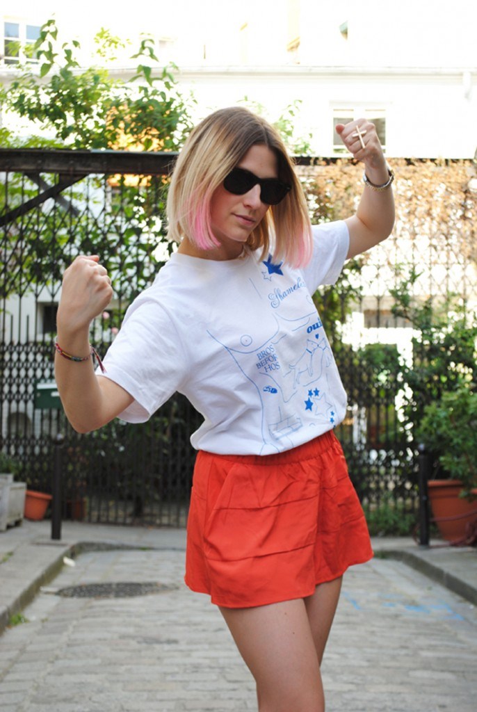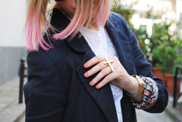 Jacket Maison Albert, Top « Marc » Jacob Don’t Switch me off, H&m shorts, Casio swatch, Asos ring, ELF polish nails (Thanks to Javari for the manicure) and indian shoes.