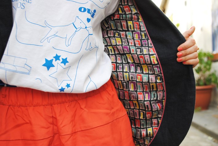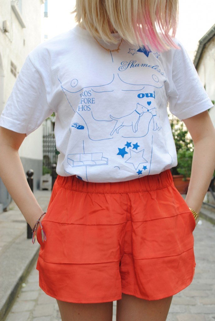 Veste Maison Albert, tee-shirt « Marc » Jacob Don’t Switch me off, short H&m, montre Casio, bague Asos, vernis ELF (merci à Javari pour la manicure) et ballerines indiennes.