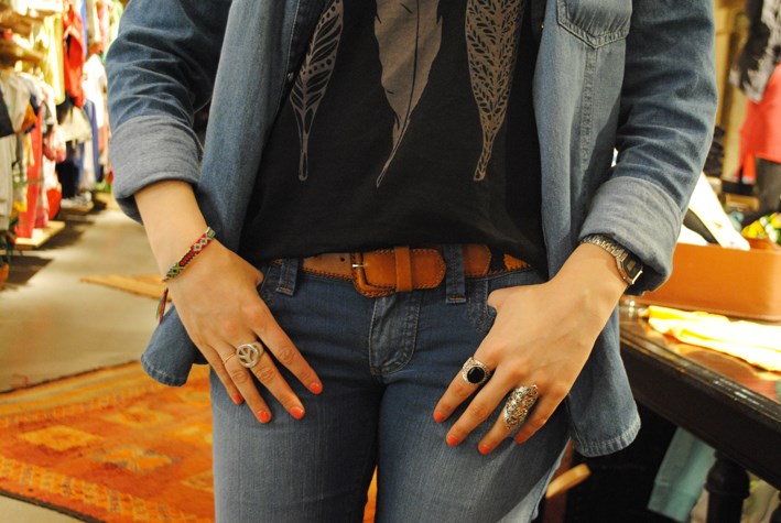 My look : denim jacket Atmosphère, top Lefties, belt Emmaus, pant flare Only, shoes(hoof) H&m, rings vintage and H&m.