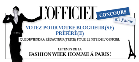 Il fallait que je vous raconte. L’officiel organise un concours entre blogueurs. Et je fais parti de leur sélection 😉 Les 3 gagnants couvriront la Fashion Week Homme pour l’Officiel.