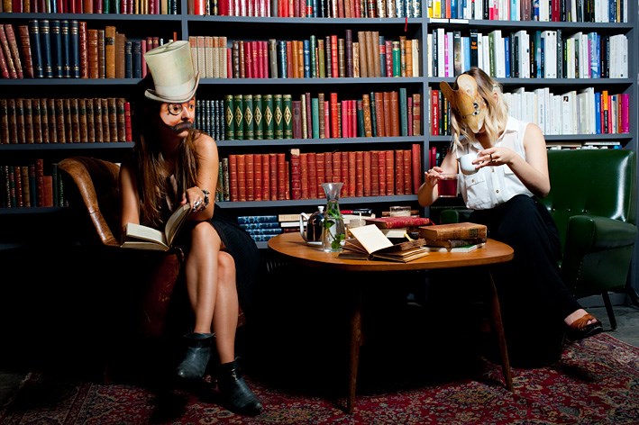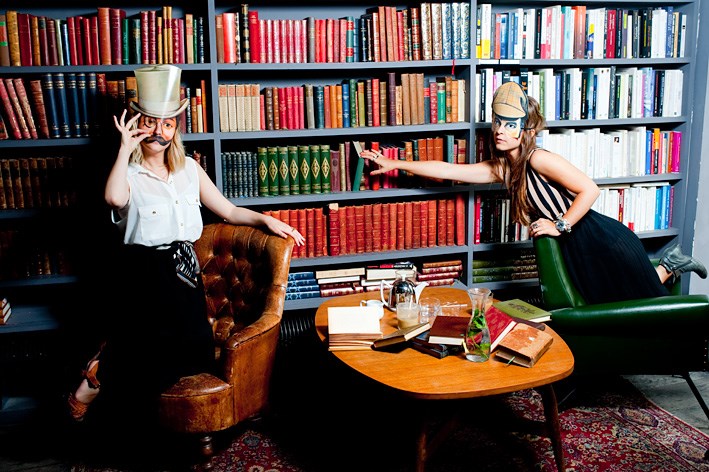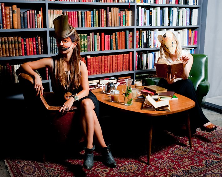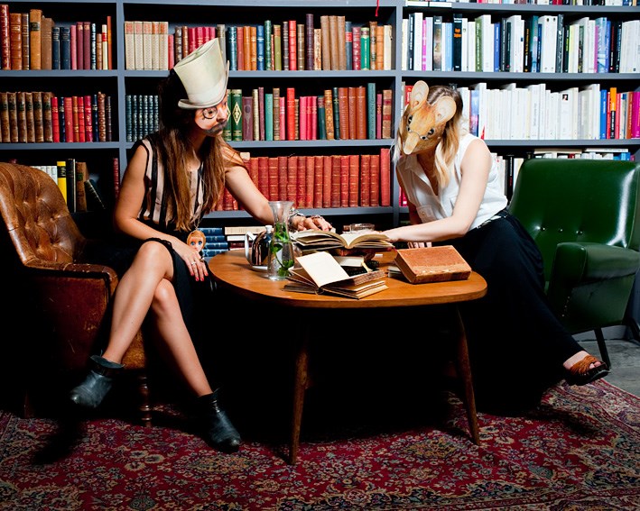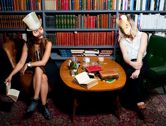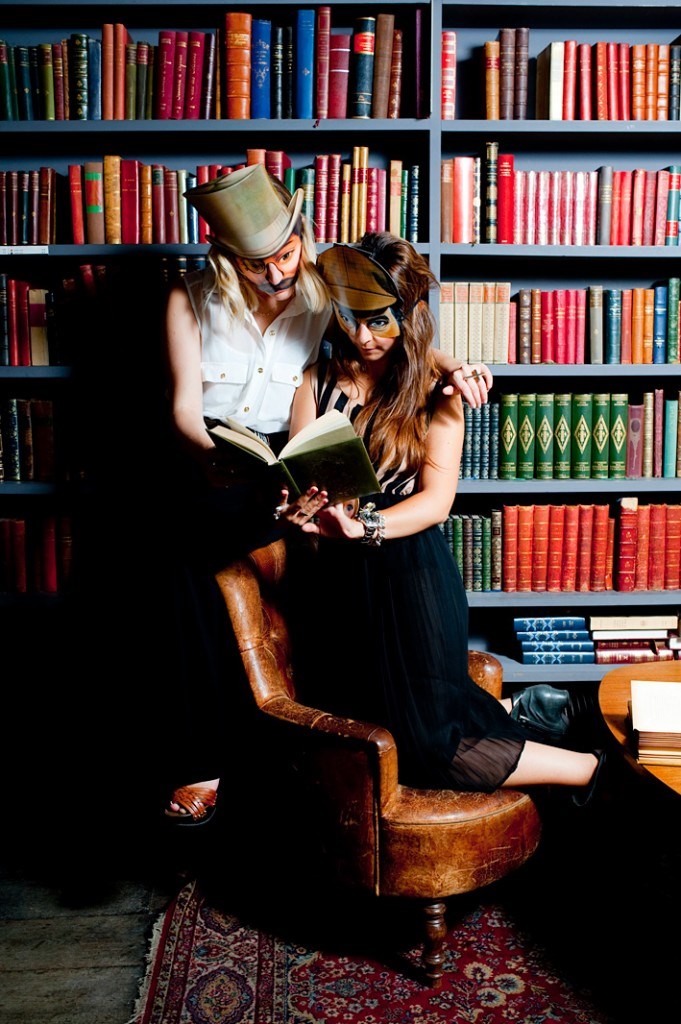 Une bibliothèque : une idée qui traine chez Valentine et moi depuis longtemps. Les masques? Une idée nouvelle qui est née avec le temps. L’ambiance : très inspirée du lieu et de l’atmosphère qui règne dans les romans et qui est cher à Valentine et moi.