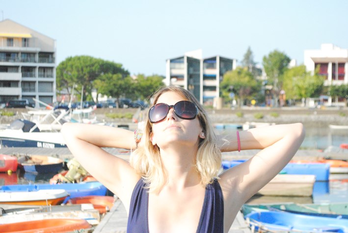 Ca ne fait pas longtemps que j'ai decouvert ton blog, mais je pense que je vais y etre fidele, j'aime beaucoup ton naturel! Tu as vraiment une très jolie peau, le genre de grain qui me donne envie de me mettre de la crème à 60, moi qui suis aussi blanche et blonde que toi, mais bronze bizarrement beaucoup. Le maillot est sublime, le vernis aussi!