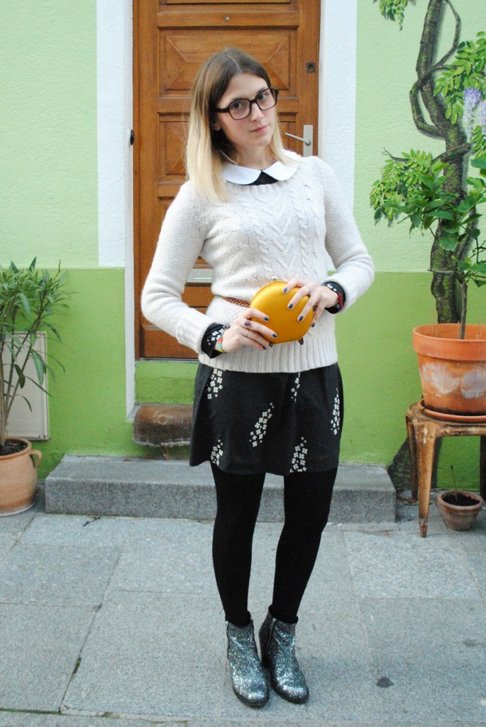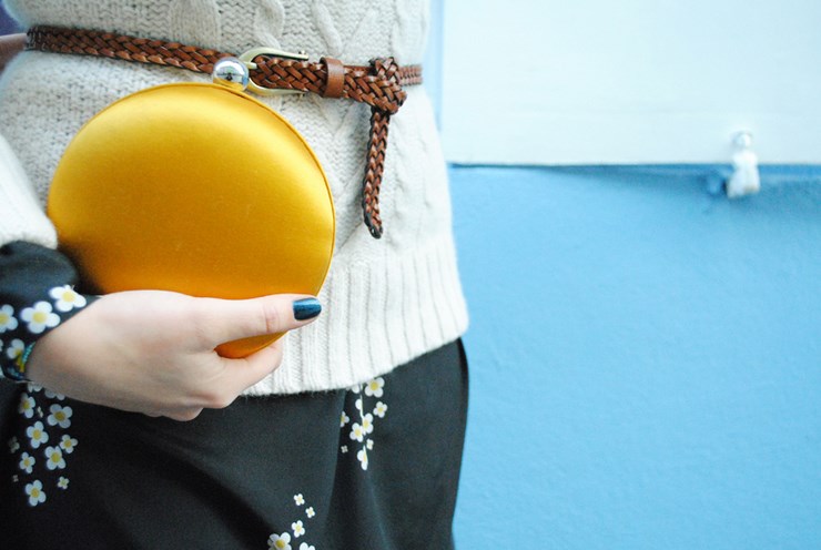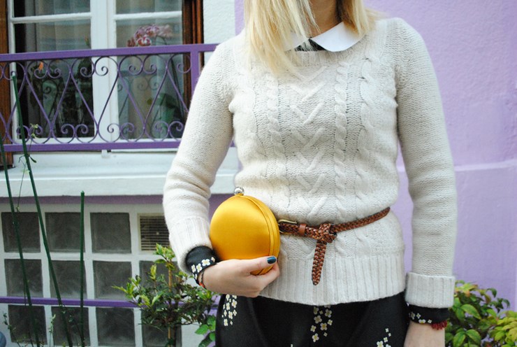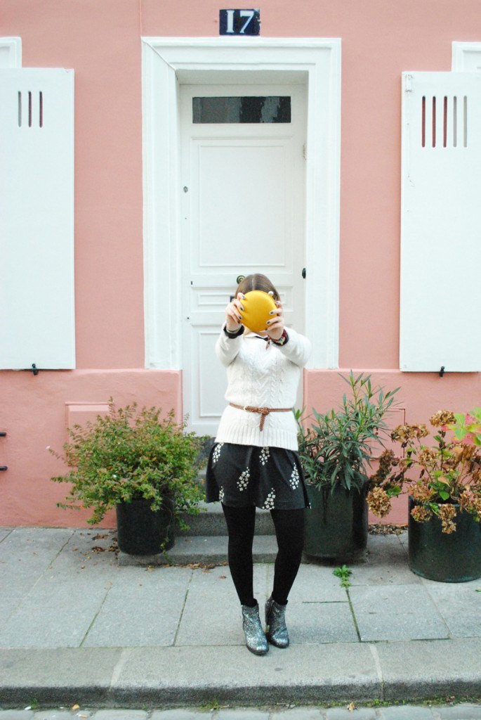 Robe Mademoiselle Tara (merci à Mimo de Pop&Roy), pull en laine H&m, ceinture New Look, boots Topshop et pochette « macaron » Kenzo.