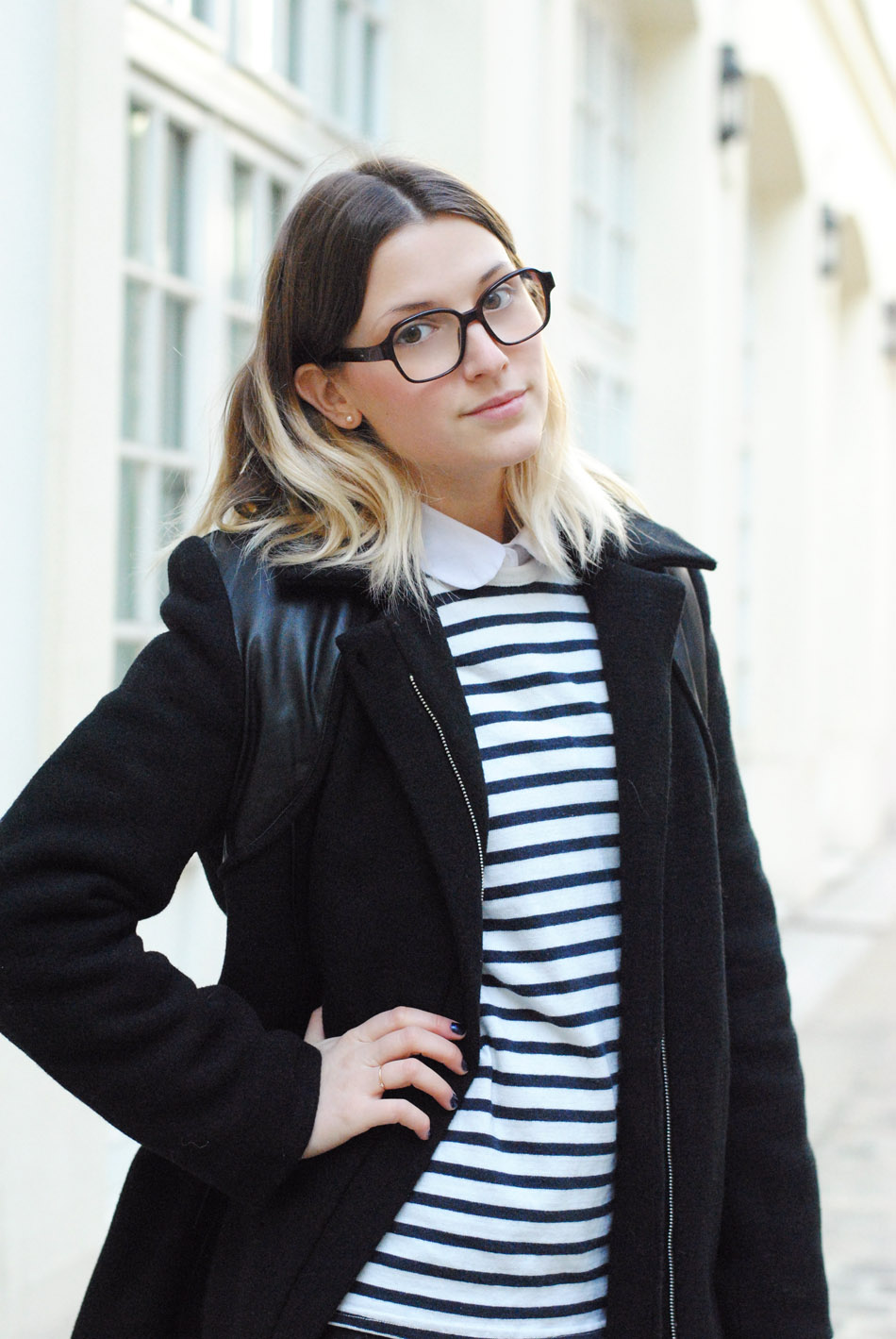 Marinière Vintage, slim Zara, chemise col claudine Baruckello, boots Topshop et manteau Bel Air.