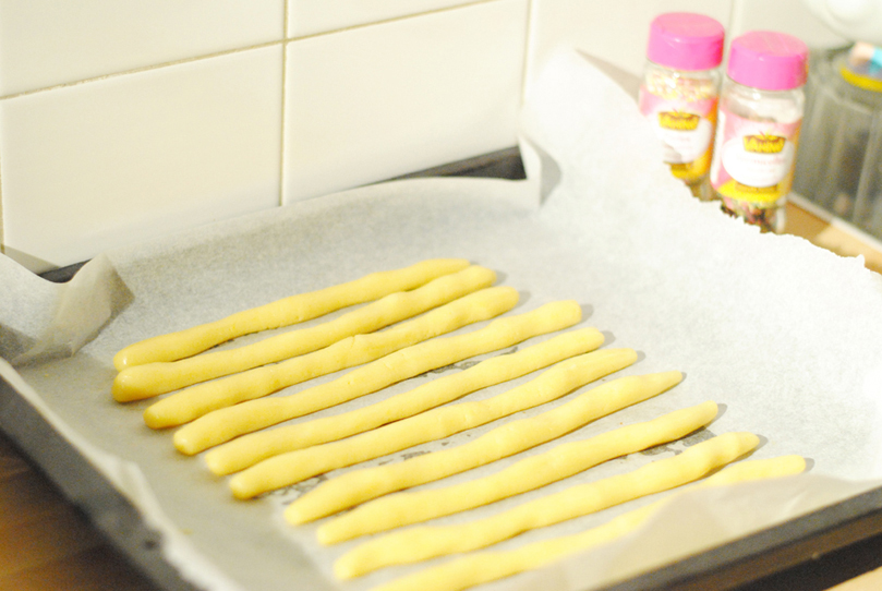 Ingrédients pour 18 pièces : 70g de beurre ramolli, 100g de sucre, 1 jaune d’œuf,  140g de farine du chocolat et des paillettes comestibles.Mélangez le beurre et le sucre jusqu’à obtenir une pommade. Incorporez le jaune d’œuf puis la farine. Formez une boule de pâte, enveloppez-la de film alimentaire puis placez-la au frais pendant 15 minutes. Sortez la pâte du réfrigérateur. Formez des boules de pâte de 2,5 cm de diamètre, puis roulez-les avec le plat de la main en bâtonnets de 20 cm. Déposez-les sur une plaque à pâtisserie recouverte de papier sulfurisé et placez-les au frais pour 15 minutes.Préchauffez votre four à 200°C (therm 6-7).Enfournez les bâtonnets 10 min, jusqu’à ce qu’ils soient dorés.