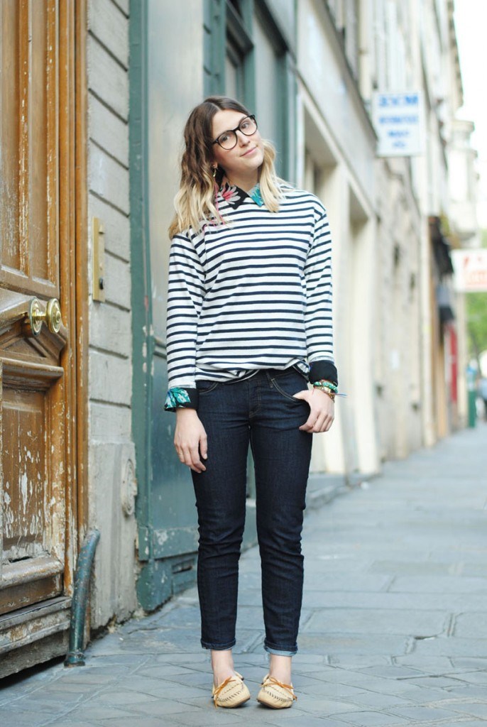 Chemise H&M, marinière Vintage, slim 7/8 Wrangler, boucle d’oreille New Look et chaussures Minnetonka.