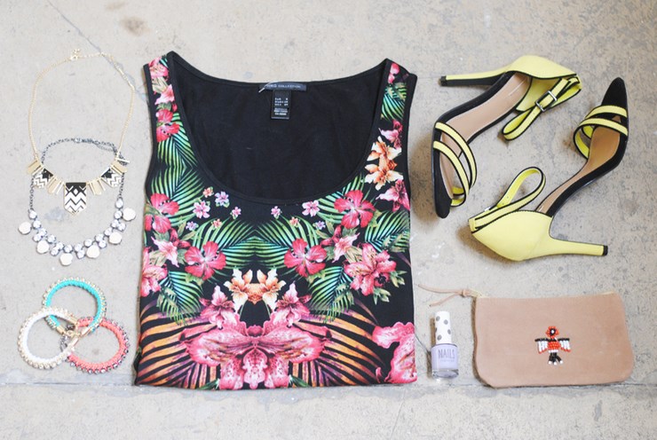 Collier ikat New Look, collier et bracelets strass H&M, top tropical Mango, heels néon Zara, vernis pastel Topshop et pochette Minnetonka.
