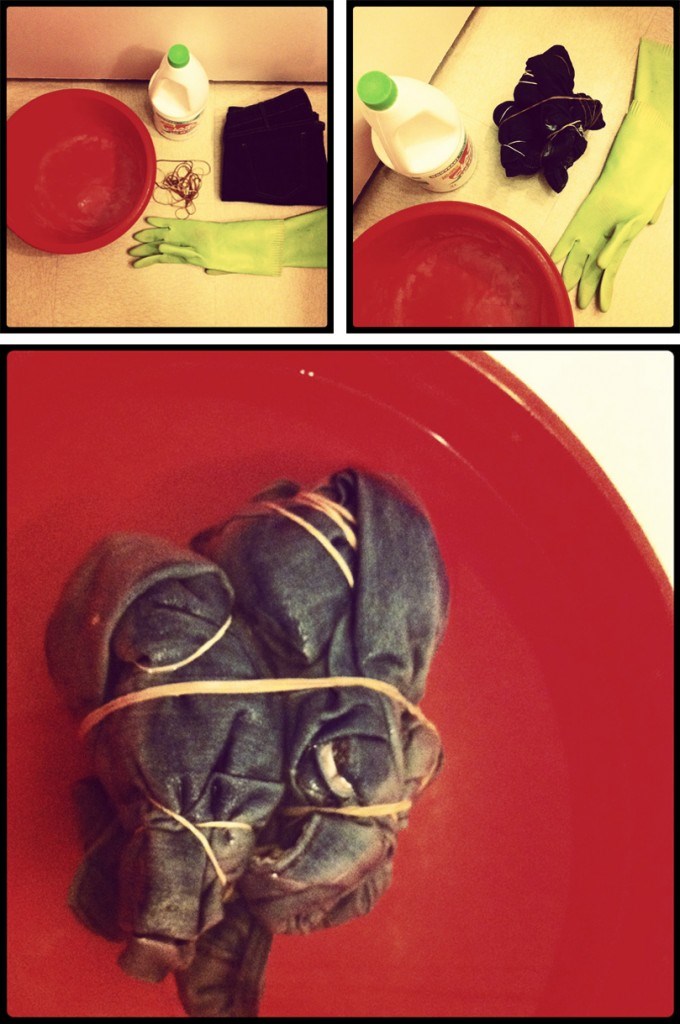 Il vous faut : une bassine , de la javel (un verre entier), des gants en caoutchouc, des élastiques de bureau et un pantalon. Grâce aux élastiques l’idée est de froisser le vêtements et d’en faire une boule de jean. Il ne reste plus qu’à laisser tremper votre pantalon jusqu’à ce que la couleur vous plaise. Dans les deux cas pensez à laver votre pièce une première fois sans lessive et une seconde fois avec (si elle sent toujours la piscine municipale n’hésitez pas à le nettoyer une troisième fois).