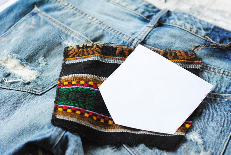 À l’aide d’une simple feuille de papier créez le patron de votre pièce rapportée. Grace à lui, découpez votre morceau de tissu. With a piece of paper, create a sewing pattern. Cut your piece of fabric with it.