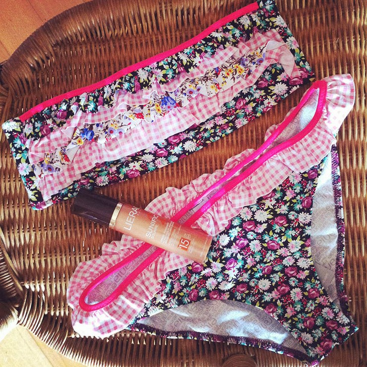 J’ai mixé les motifs sur le bandeau, j’ai choisi des finitions rose fluo et un volant sur la culotte.