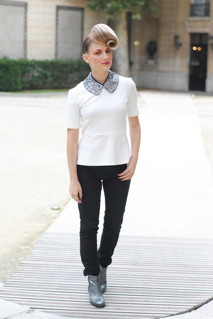 Top péplum Mango, slim Cheap Monday, col Karl Lagerfeld et boots Topshop.