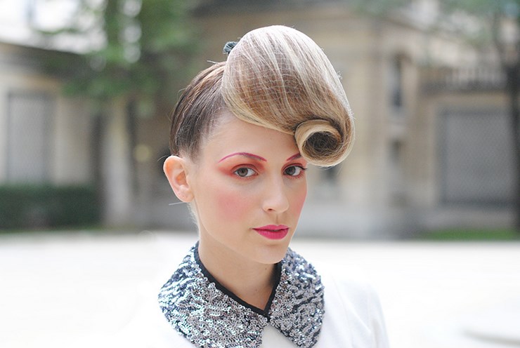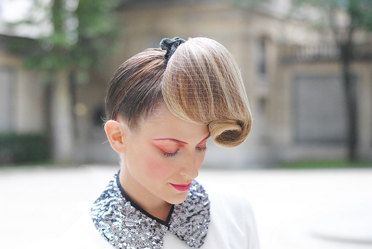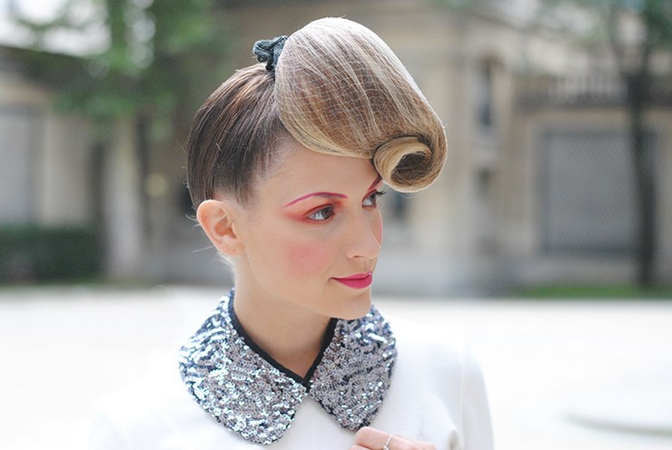 Ma coiffure « escargot » avait commencé rose et puis finalement mon coiffeur a travaillé seulement avec mes mèches blondes. C’est très original mais j’aime beaucoup.