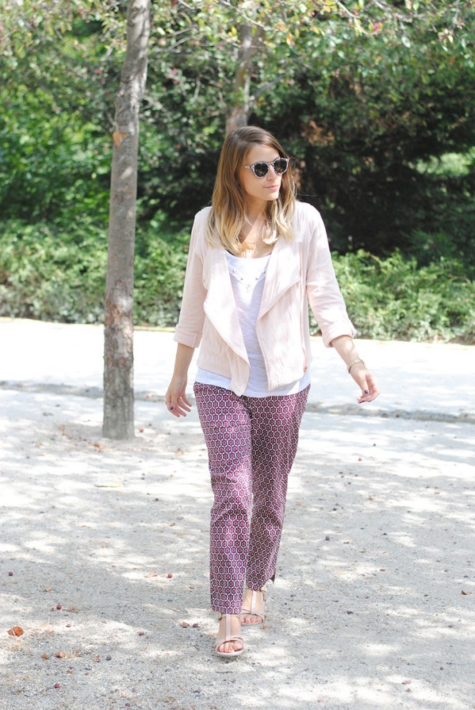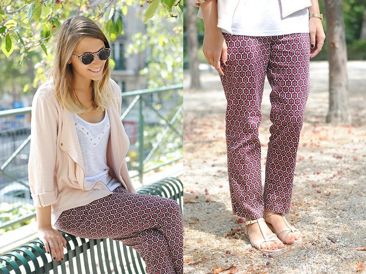 J’ai hésité un moment sur la blouse H&M aux même motifs que ce pantalon. Mais quand j’ai découvert le bas assorti je ne me suis plus posé de questions. Je l’ai ici associé avec du rose poudre mais cette hiver il sera parfait avec un gilet noir ou ce pull lie de vin.
