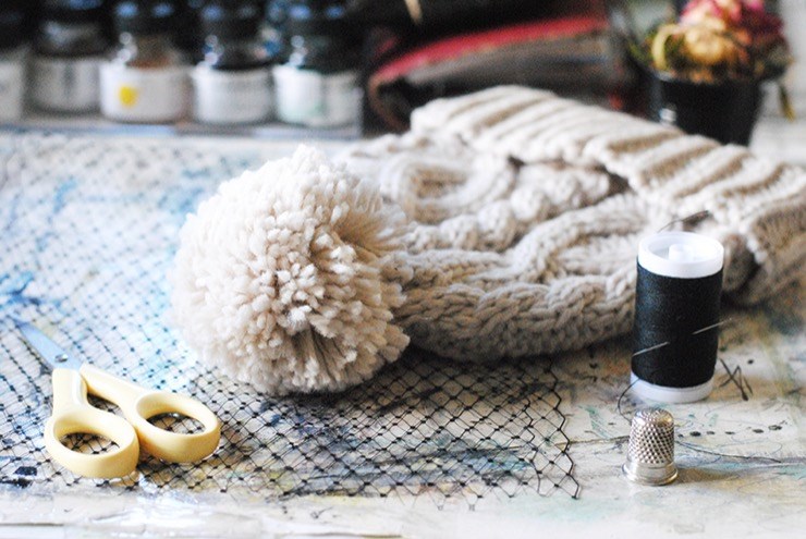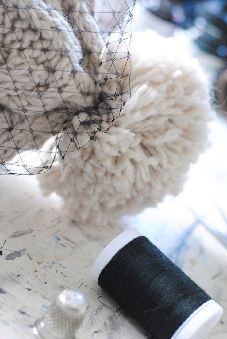 Il ne reste plus qu’à coudre la voilette autour du pompon. Le fil doit être noir et les points cousus à la base du pompon.