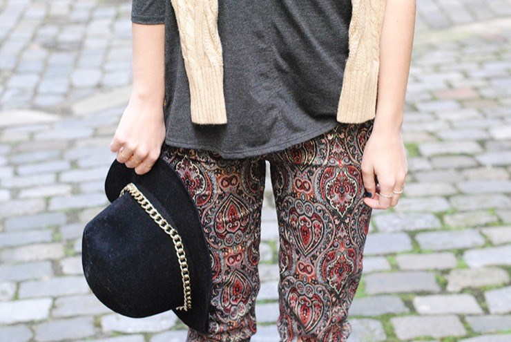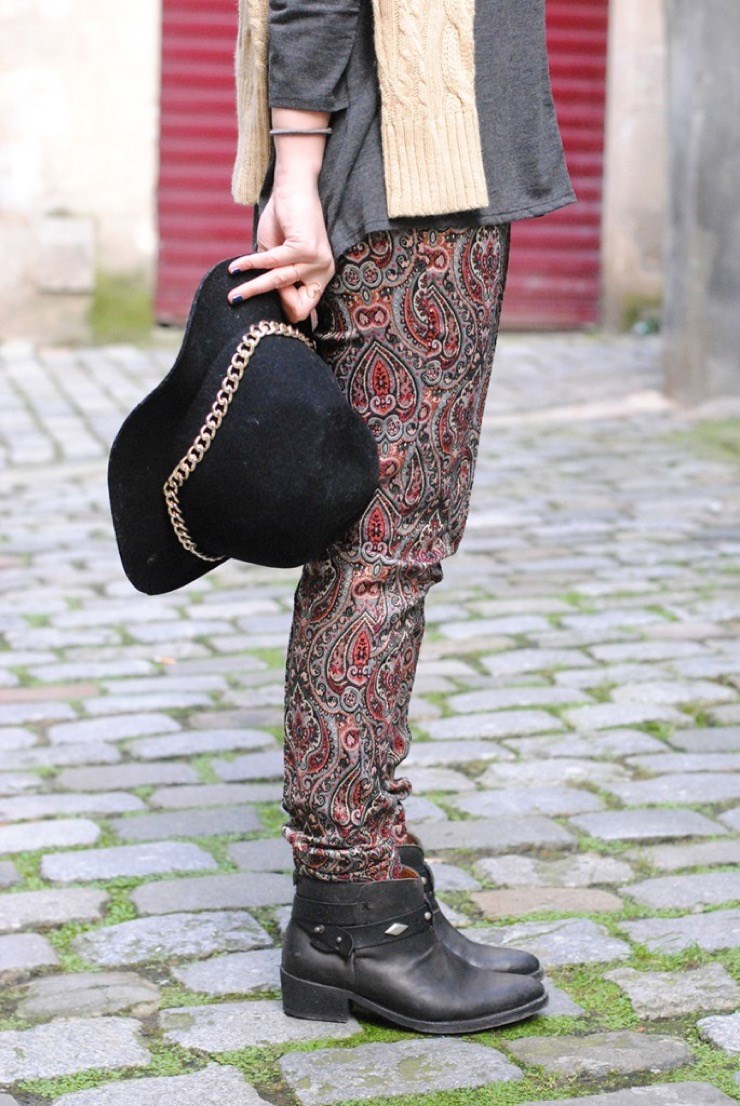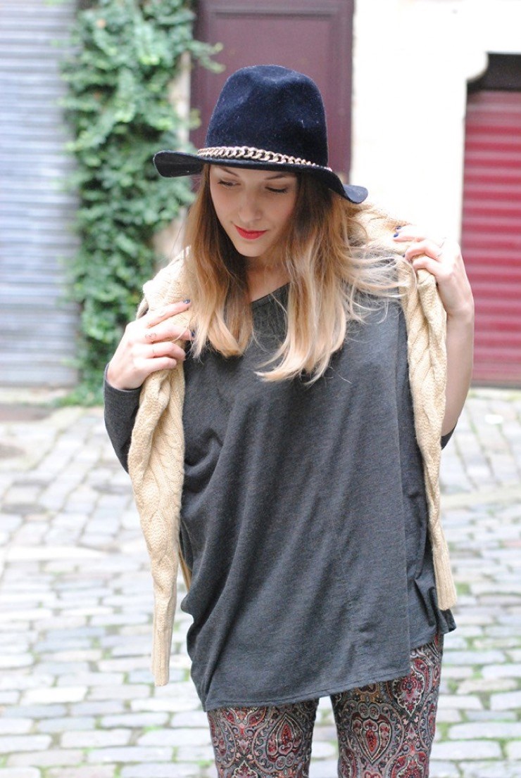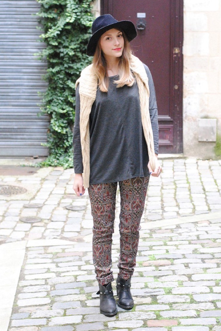 Chapeau, tee-shirt et pantalon Zara, boots Koah via Sarenza et pull Quiksilver Women.
