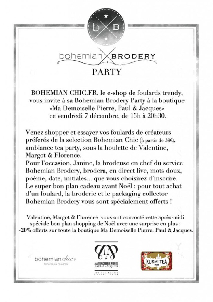 L’idée de ce goûter est de passer un bon moment en compagnie de Valentine, Florence et moi, de vous faire découvrir la boutique et Bohemian Chic.fr. Pour tout achat d’un foulard (à partir de 39€) la broderie vous sera offerte (vos initiales, le prénom de l’amoureux, la date clé de votre vie…), sans oublier -20% sur toute la boutique.
