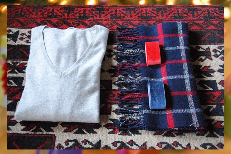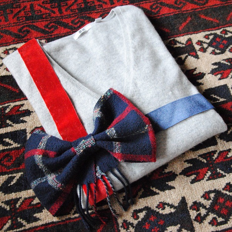 Coudre les rubans en croix sur le devant du pull. Les deux rubans doivent se croiser au niveau de cœur. C’est à cet endroit que le nœud se coud ensuite tel un paquet cadeau. Utiliser du fil de la même couleur que les rubans.