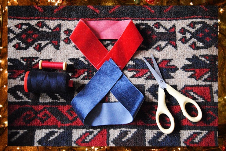 3 – Découper un second morceau dans l’écharpe de 4 x 8cm. Il servira à fermer le nœud à l’aide d’un point de couture.