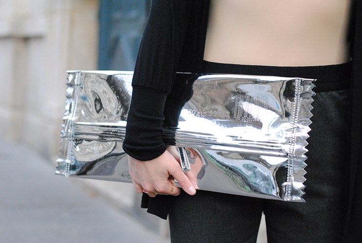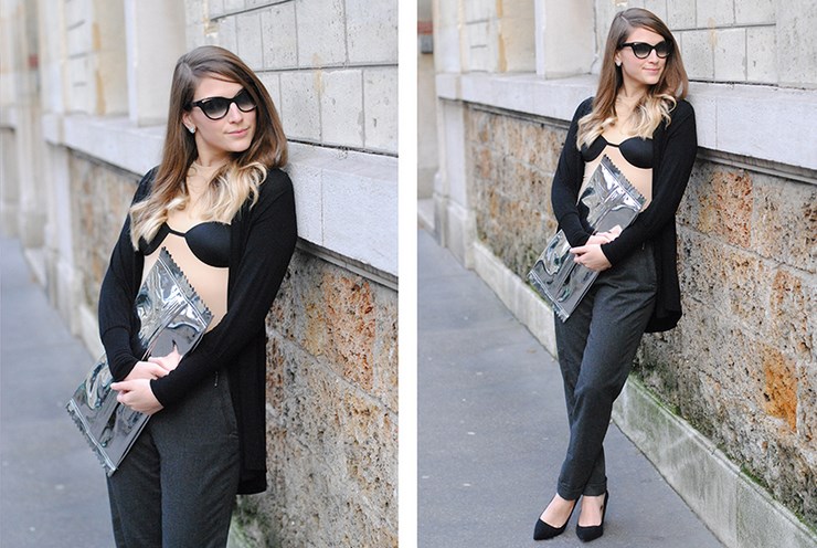 Gilet Jennyfer, body et pochette Maison Martin Margiela pour H&M, pantalon et talons Zara,