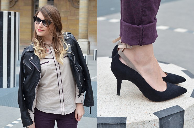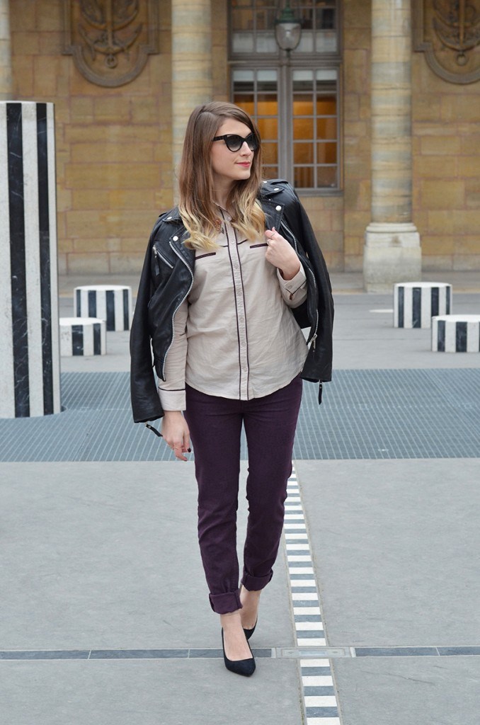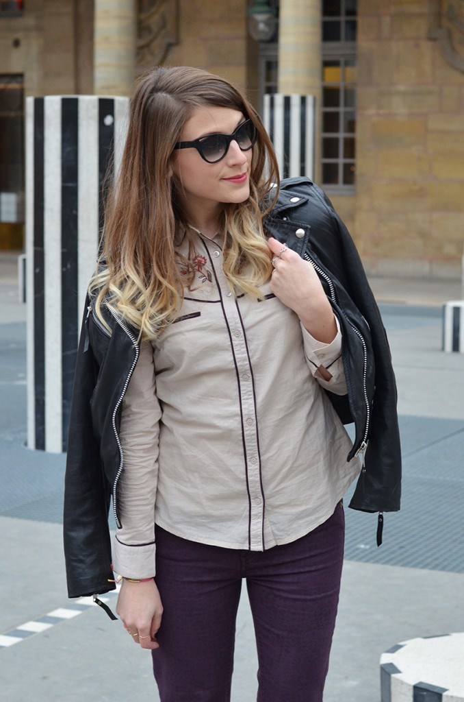 24 janvier 2013 at 5 h 56 minUne association qui détonne, perfecto, chemise (type un peu isabelle marant?^^) et ce pantalon prune, c'est un mélange de douceur et de fermeté en plus de ces sublimes escarpins !