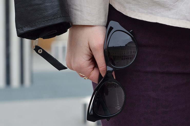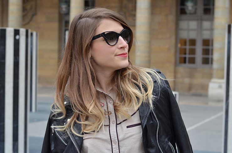 Perfecto La Canadienne, chemise Camaïeu, pantalon Shine Paris via So Jeans, escarpins Zara et lunettes de soleil Sonia Rykiel (similaire ICI à 16€).