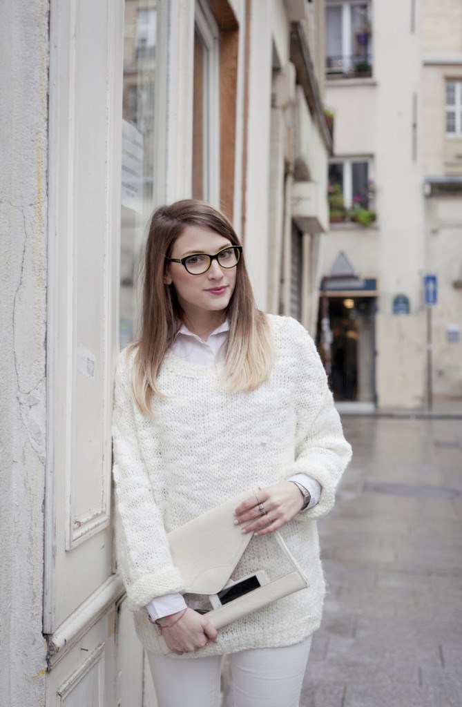J’ai passé le premier jour des soldes au lit et à faire mon shopping sur internet. J’ai craqué sur le e-shop de Jennyfer. C’est là que j’ai comblé mon envie de total look blanc (complété par cette pochette plexi trouvée elle aussi en soldes l’été dernier). Pour moins de 50€ j’ai déniché ce pull loose, ce slim et cette paire de boots (9€!!!).