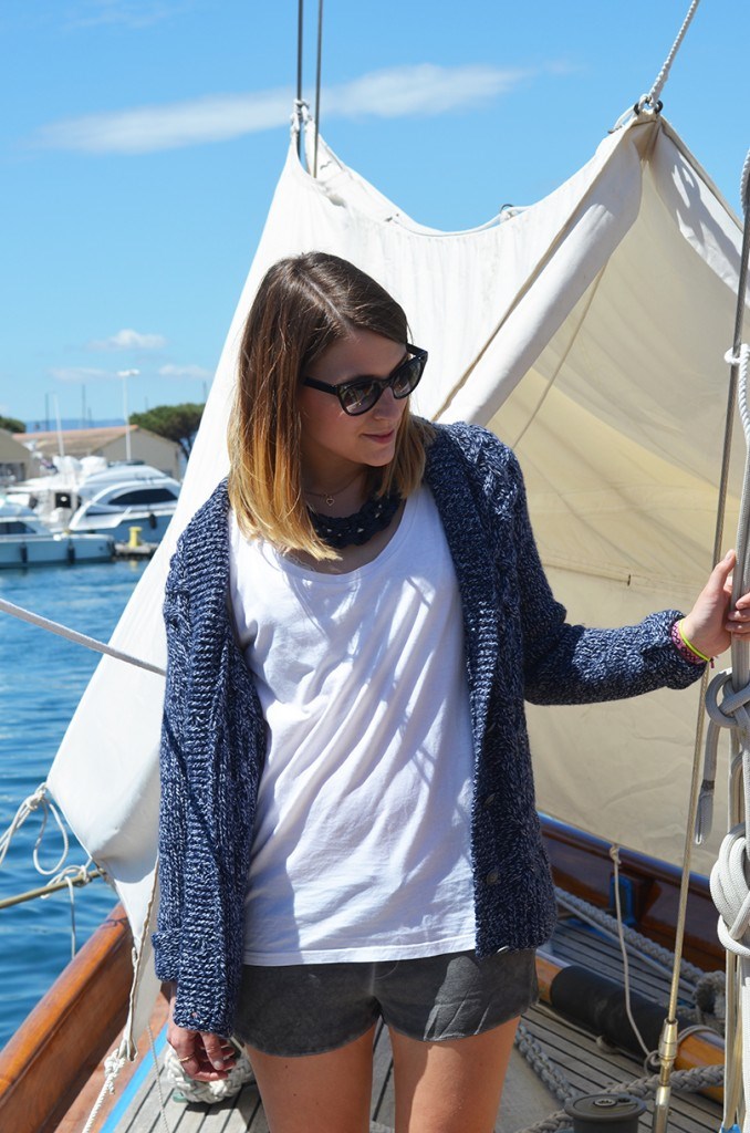J’ai été invitée chez Blanc Bleu à créer une tenue. J’ai craqué sur ce mini short avec un gilet en grosses mailles. Beau soleil oui mais même à Saint Tropez il ne fait encore bien chaud…